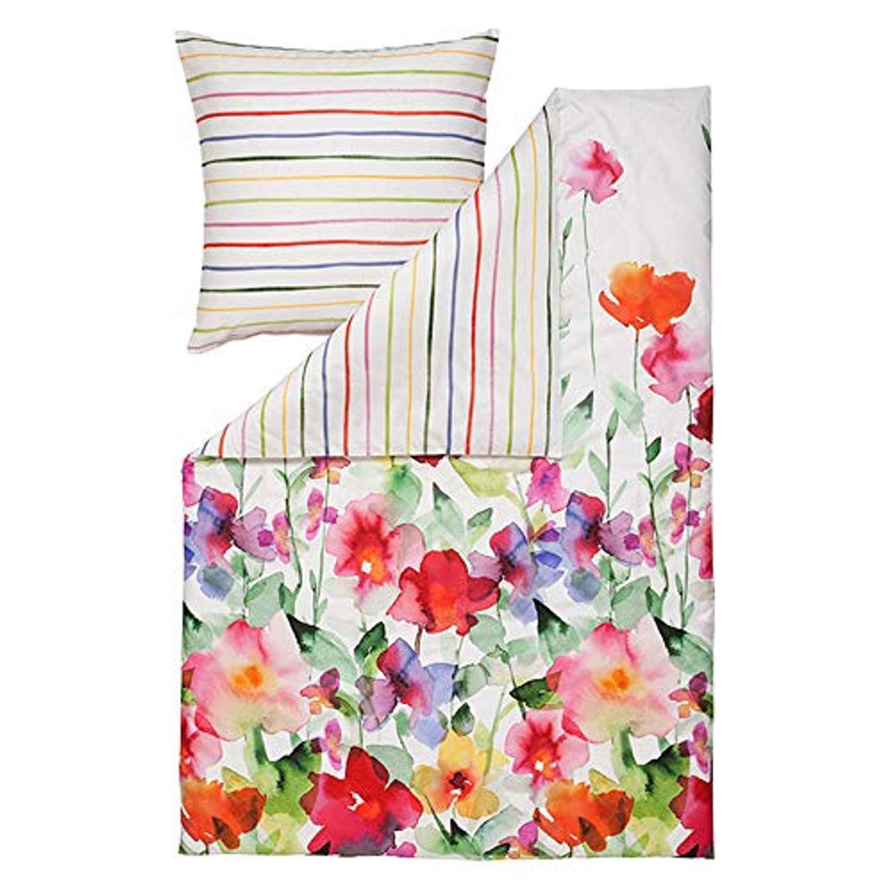ESTELLA Bettwäsche Aquarell MulticolorDiese Estella Bettwäsche in Wendeoptik ist ein ganz besonderes Schmuckstück. Das in farbenfroher Aquarelltechnik gestaltete Blumenmotiv kommt durch das hochwertige Druckverfahren besonders detailliert zur Geltung und verwandelt Ihr Schlafzimmer in eine sommerlich strahlende Blumenwiese. Die Abseite dieser aus 100 Prozent Baumwolle in Mako Satin Qualität hergestellten Garnitur, ist in einem eleganten und stilvollen Streifenlook gehalten, der mit bunten Farbtönen für Freude sorgt.Um die Farbqualität zu bewahren, müssen farbintensive Artikel bei den ersten Wäschen unbedingt mit der auf dem Waschzettel angegebenen Temperatur und nicht darunter gewaschen werden.Dekorationsartikel auf dem Bild sind nicht Bestandteil dieses Angebotes. Unterschiedliche Bildschirmeinstellungen können zu leichten Farbabweichungen im Vergleich zum Originalprodukt führen.