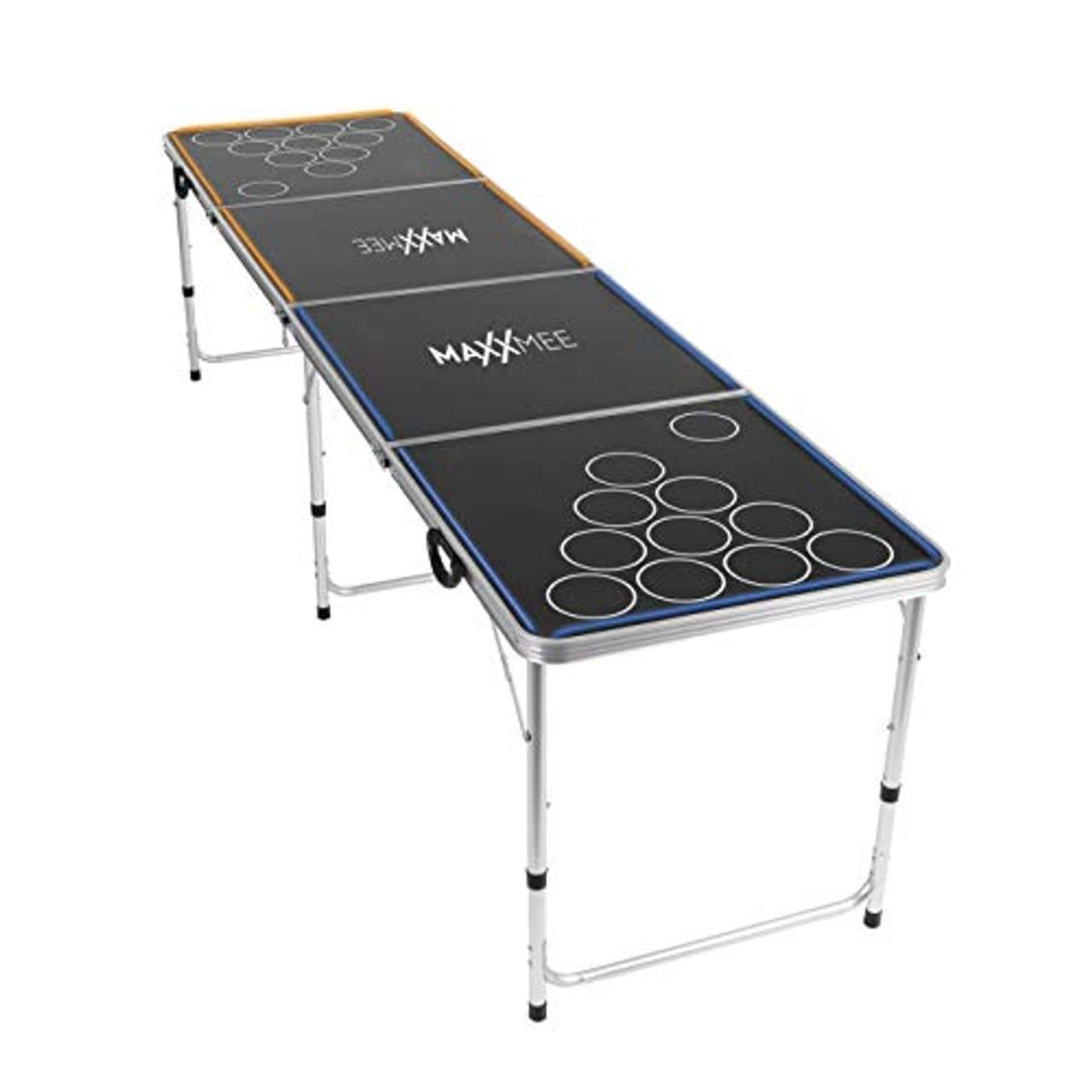 MAXXMEE Beer Pong TischspielBeer Pong gehört zu den Kultspielen auf jeder Party und vereint Geschicklichkeit mit Teamgeist! Mit dem MAXXMEE LED Beer Pong Tisch entdeckst du den Fun-Klassiker in einer neuen Dimension: Faszinierende LED-Effekte machen das Spiel vor allem im Dunkeln besonders reizvoll.Der LED Beer Pong Tisch ist im Handumdrehen aufgestellt, höhenverstellbar an jede Körpergröße anpassbar und kommt dank Batteriebetrieb ohne störende Stromkabel aus. Zusammengeklappt kannst du ihn auch einfach und unkompliziert zur nächsten Party mitnehmen oder bis zum nächsten Event platzsparend verstauen.Übrigens eignet sich das megacoole Party-Game für drinnen und draußen gleichermaßen - für maximalen Spielspaß immer und überall! Details: Maße (L x B x H): ca. 240 x 60 x 70 cm Spannungsversorgung: 6 V DC (4 x 1,5 V-Batterie; AA ) Maße ausgeklappt: ca. 240 x 60 x 70/62/55 cm Maße zusammengefaltet: ca. 60 x 13 x 60 cm Max. Belastbarkeit: ca. 50 kg Gewicht: ca. 9,5 kg Lieferumfang: 1 x Tisch mit zwei Batteriefächern Hinweise: Dieses Produkt ist als Spieltisch für den Innen- und Außenbereich geeignet. Material: ABS, Aluminium, Mitteldichte Holzfaserplatte (MDF), PVC
