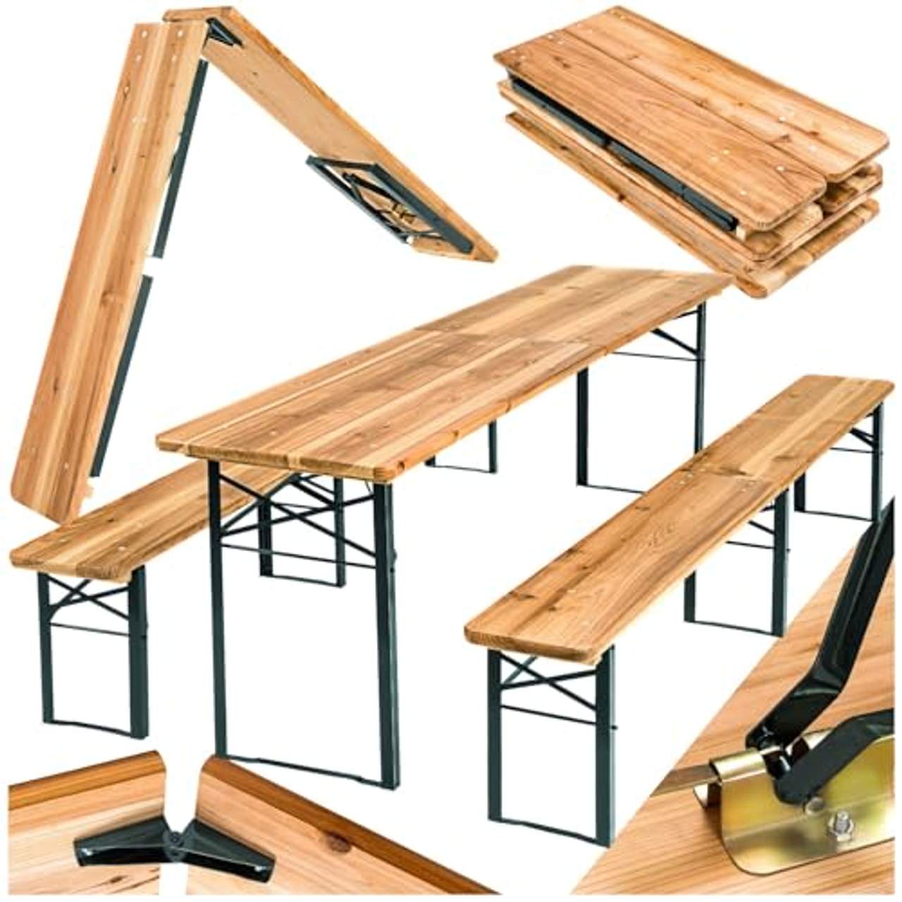 - Robuste Materialien: Die tectake Bierzeltgarnitur ist aus hochwertigem Tannenholz mit einer schützenden Klarlackbeschichtung gefertigt und verfügt über robuste Materialien, die sowohl ihre Ästhetik als auch ihre Funktionalität verbessern. Die wetterfeste Lackierung schützt die Möbel vor Regen und Sonne und sorgt für Langlebigkeit auch bei häufigem Einsatz im Freien. Die nachhaltige Beschaffung des Tannenholzes unterstreicht die Qualität und gibt den Kunden ein gutes Gefühl beim Kauf eines ebenso stilvollen wie umweltfreundlichen Produkts.