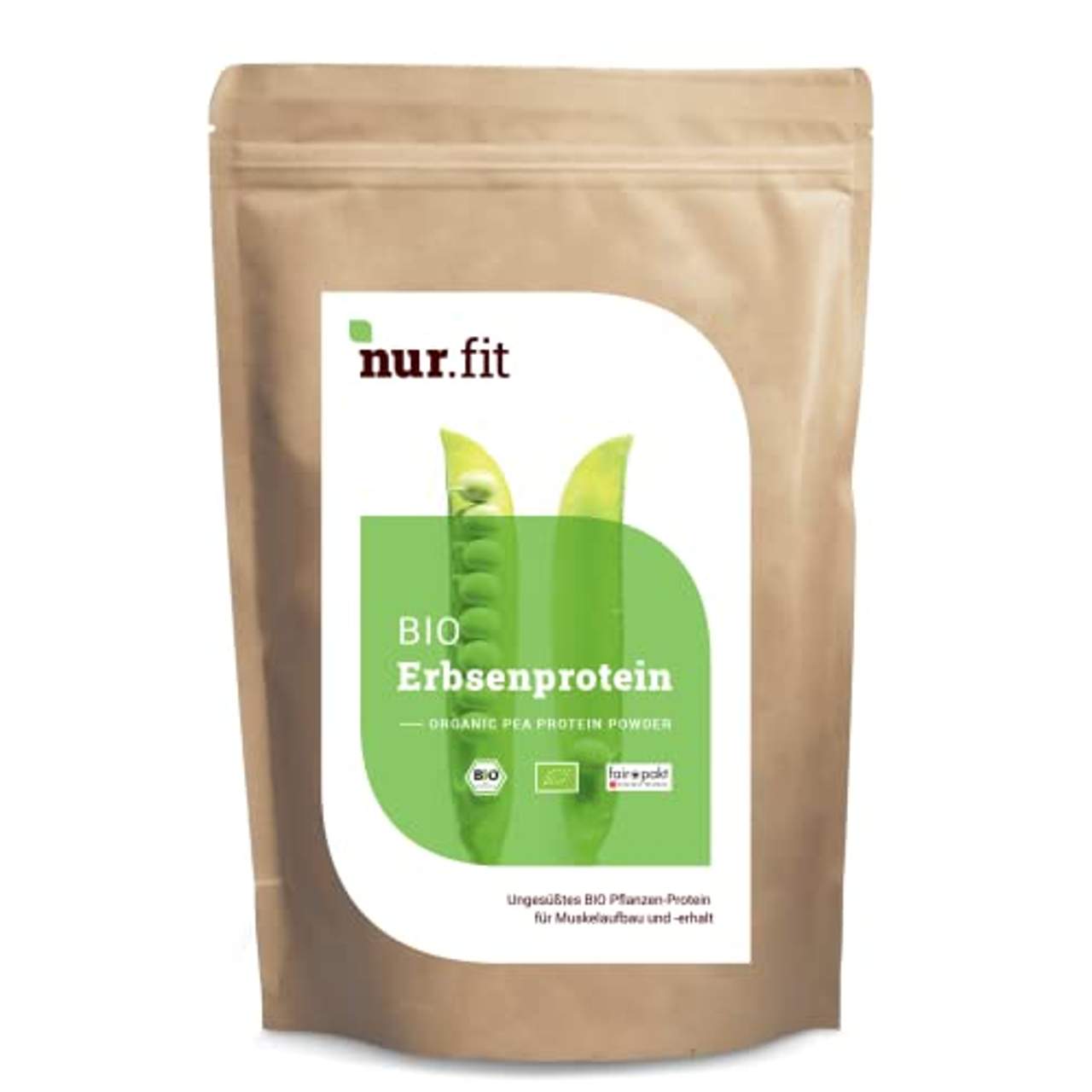 nur.fit by Nurafit BIO Erbsenprotein-Pulver 1kgEin rein pflanzliches Proteinpulver, welches weder Milch noch Ei als Eiweißlieferanten enthält und außerdem ungesüßt ist, hast du hiermit in bester Qualität gefunden. Das Bio Erbsenprotein Pulver, wird zu 100% aus reinen Erbsen hergestellt und ist ein hochwertiges Supplement für Diabetiker, Veganer, Vegetarier oder Allergiker!Das Proteinpulver überzeugt mit einem Proteingehalt von 80g/100g und lässt sich durch den leicht erbsigen Geschmack in jegliche Art von Eiweißshakes oder auch Smoothies optimal integrieren. Das Pulver ist besonders löslich, damit dein Eiweiß-Shake nicht verklumpt. Kauf dir jetzt unser Bio Erbsenprotein Pulver, um deinen Körper während und nach dem Training mit viel Energie und Nährstoffen zu versorgen!Diese vegane Alternative, ohne Zusatzstoffe, ist allerdings nicht nur eine gute Proteinquelle, sondern besitzt zudem eine hervorragendes Aminosäureprofil, was das Erbsenproteinpulver zu einem idealen Lieferanten für Aminosäuren für Bodybuilding, Muskelaufbau und -erhalt nach einem intensiven Workout macht.Proteine sind für den Aufbau und dem Erhalt von Muskelmasse besonders wichtig! Isoleucin, Leucin, Lysin, Valin, Phenylalanin, Threonin, Methionin und Tryptophan sind als essentielle Aminosäuren enthalten. In diesem Eiweißpulver ist besonders viel Leucin sowie Lysin enthalten.Auf 100g überzeugt es mit 6,13g Lysin und 7,12g Leucin. Außerdem beinhaltet das Erbsenprotein-Pulver unter anderem Glutamin, Arginin, Alanin, Asparagin, Glycin und Cystein als semi- oder nicht essentielle Aminosäuren. Muskelaufbau durch pflanzliche Proteine?Unter Leistungssportlern besteht der Mythos, dass Muskeln nur über die Einnahme von tierischen Proteinen aufgebaut werden können. Aber auch Pflanzen sind gute Proteinquellen. Bei einer gesunden und ausgewogenen Ernährung hilft dir unser Bio Erbsenprotein Pulver bei der Steigerung deiner Proteinzufuhr.Somit kannst du auch als Veganer oder Vegetarier über pflanzliche Proteine, deinen Eiweißbedarf decken und problemlos Muskelmasse aufbauen! Falls Erbsen nicht ganz so deinen Geschmack treffen sollten, dann findest du neben unserem Bio Erbsenprotein Pulver weitere pflanzliche Eiweißquellen wie z. B Bio Reisprotein, die dir dabei helfen, deinen Körper fit und gesund zu halten. Empfohlen wird, die Eiweißpulver aus Erbsen und Reis zu kombinieren, um ein optimales Aminosäureprofil zu erhalten. Inhalt: 500g l ca. 16,5 Portionen Geschmack: neutral, Erbsig Zutaten: Das pflanzliche Protein Pulver besteht aus 100% reinem Erbsenprotein* aus kontrolliert Ökologischem AnbauHinweise: Zertifikate, Herkunft & Produktanalysen: BIO Erbsenprotein Pulver