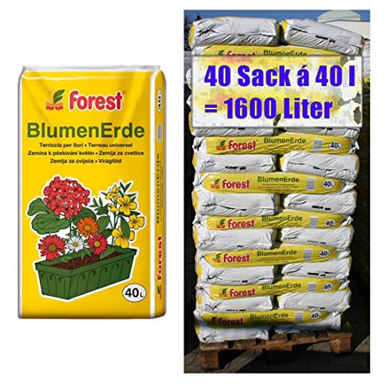 Wie viel Blumenerde ist in einem Sack Blumenerde Forest 40 Sack (1600l) enthalten?
