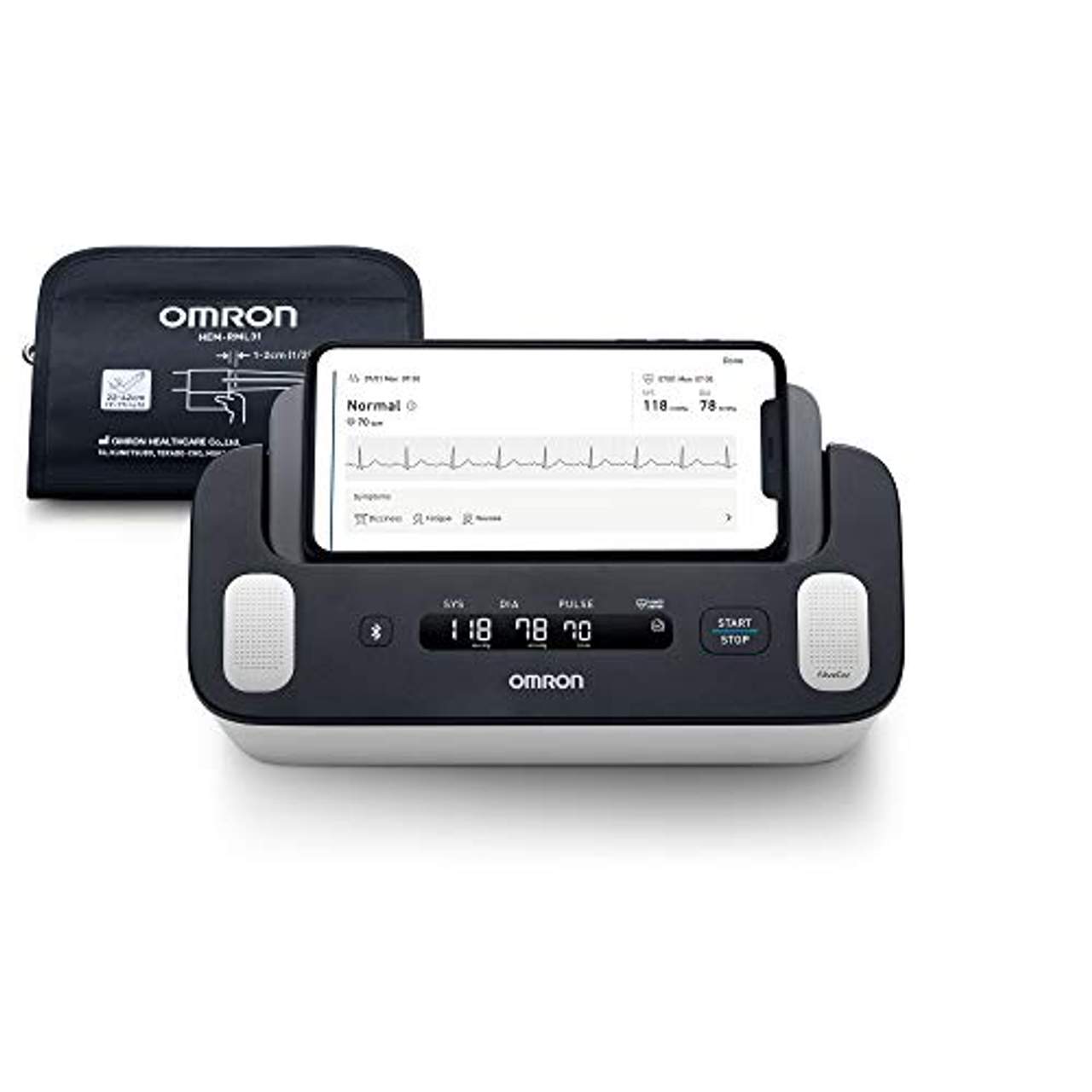 Omron Complete smartes Oberarm-BlutdruckmessgerätOMRON Complete OMRON Complete ist ein klinisch validiertes, smartes, leicht bedienbares 2-in-1-Blutdruckmessgerät und EKG für zu Hause, das in kürzester Zeit präzise Ergebnisse liefert. Sie können damit ganz einfach zwei kritische Messwerte auf einmal ermitteln – für eine unkomplizierte Überwachung der Herzgesundheit bequem bei sich zu Hause. Schnelles Screeing einer Reihe von Funktionsstörungen des Herzens in einem Vorgang, einschließlich Herzrhythmusstörungen wie AFib (Vorhofflimmern), Tachykardie, Bradykardie und Bluthochdruck. In der kostenlosen OMRON connect-App werden die Ergebnisse leicht verständlich dargestellt und gespeichert, sodass Sie sie auf Wunsch problemlos auch Ihrem Arzt vorlegen können.Produktdetails Gerätetyp: Oberarm-Blutdruckmessgerät mit 1-Kanal-EKG Manschette: Universal-Manschette, 22 bis 42 cm Speicher: 90 Blutdruckwerte Validierung: Klinisch validiert Kompatibilität: Android und IOs Kopplung mit OMRON connect-App Abmessungen (LxHxT): 232 x 98 x 123 mm Gesamtgewicht: 1630 g Eigenschaften und Sicherheitshinweise AFib (Vorhofflimmern) geht mit einem 5-fach höheren Risiko von Schlaganfall und Herzversagen einher. Entsprechend wichtig sind Früherkennung und ein früher Behandlungsbeginn. Leider treten bei Vorhofflimmern häufig keine Symptome auf und es kann auch bei einem Arztbesuch nicht unbedingt festgestellt werden, da die Episoden kommen und gehen.Daher wird Vorhofflimmern oft nicht diagnostiziert. Da es aber mit potenziell schwerwiegenden Komplikationen einhergeht, sind regelmäßige EKGs (Elektrokardiogramme) gemäß aktueller medizinischer Leitlinien gerade für Personen aus Risikogruppen besonders wichtig. OMRON Complete ist NICHT zur Diagnose von Herzerkrankungen ohne Abklärung durch medizinisches Fachpersonal geeignet.Lassen Sie sich vor Gebrauch von medizinischem Fachpersonal beraten.