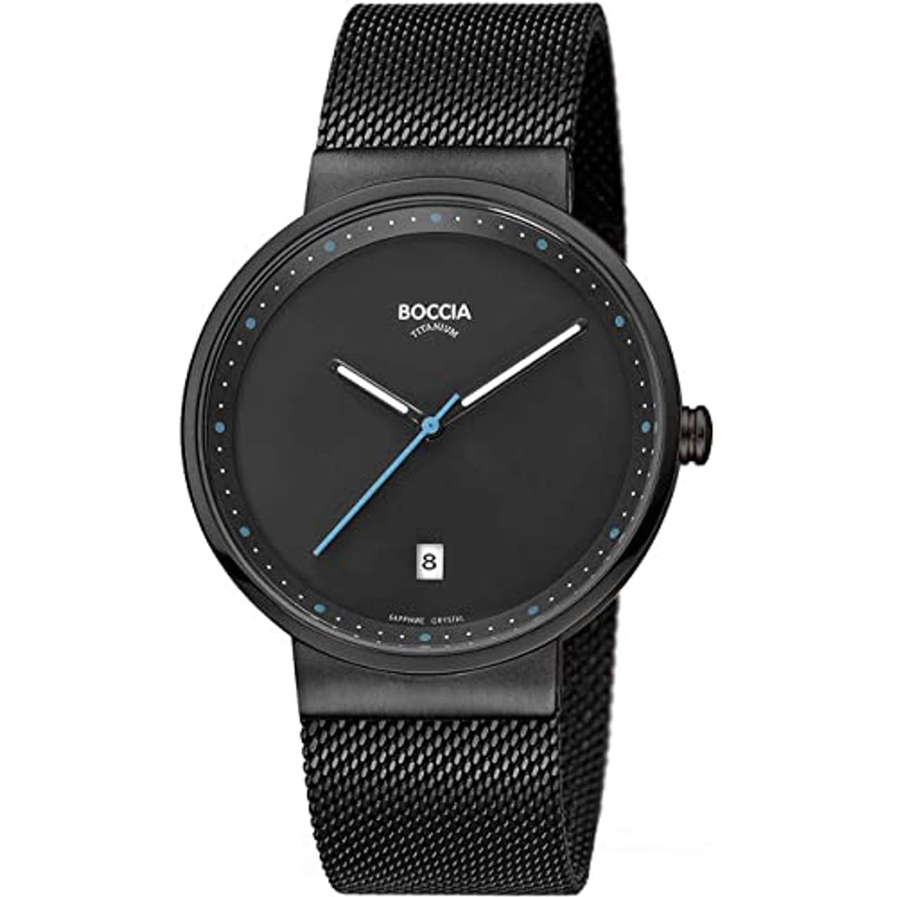 Boccia Herren Analog Quarz Uhr 3615-02Klassisch-elegante Herren Armbanduhr von BOCCIA TITANIUM, schwarzes Titangehäuse, flaches Saphirglas, schwarzes Zifferblatt mit weiß/blauen Zeigern, Datumsanzeige, Milanaise-Edelstahlband mit verstellbarer Schließe, batteriebetriebenes Quarzwerk, wasserdicht bis 5 bar, Gehäusegröße ca. 38 x 38 x 7 mm, Armbandlänge verstellbar von ca. 20,5 cm bis 15 cm, Lieferung in original Boccia Präsentbox