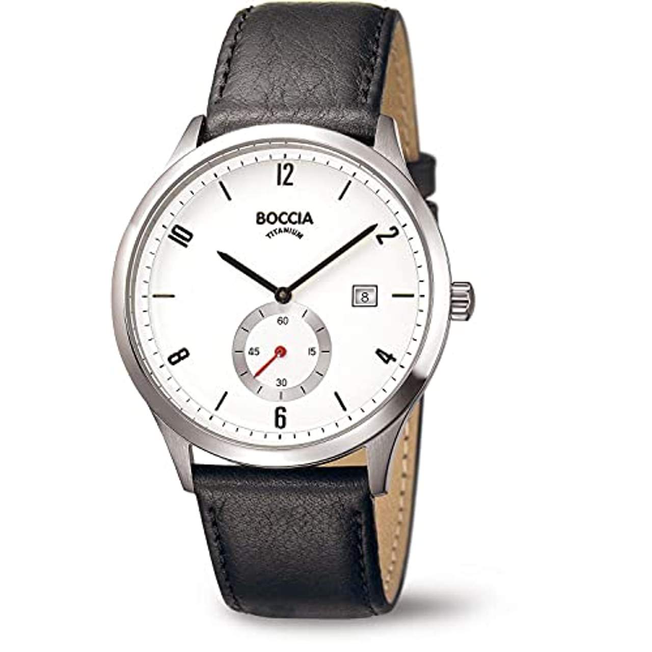 Boccia Herren Digital Quarz Uhr 3606-01Boccia Herrenarmbanduhr TitanWerk: Quarzwerk mit Datums- und SekundenanzeigeGehäuse: Titan, ca. 42 mm ØStärke: ca. 9,5 mmGlas: MineralglasBand: Leder schwarzZifferblatt: weißZeiger und Indexe: schwarz Sekundenzeiger: rotWasserdichtigkeit: 5 ATMZe 1