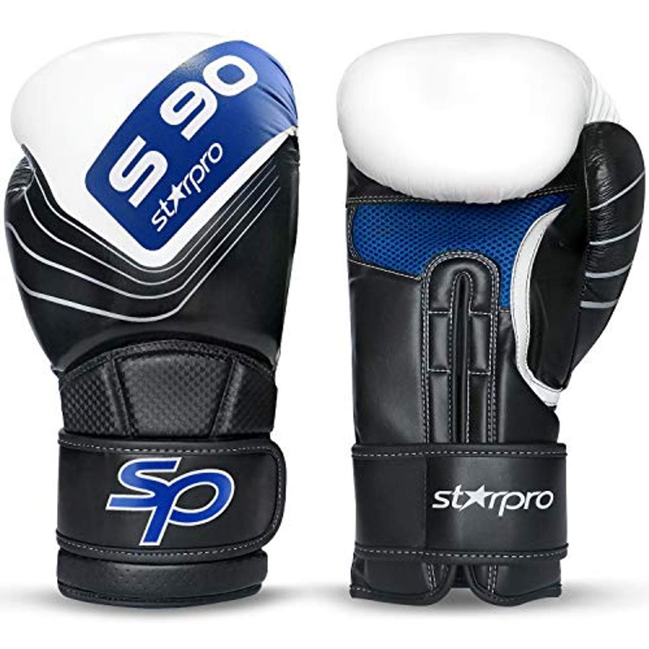 Starpro Boxhandschuhe Muay Thai Training BoxsackStarpro S90 Trainings Boxhandschuhe für Frauen und MännerStarpro S90 Trainings boxhandschuhe für Frauen und Männer sind ideal für Boxen, Kickboxen und Training. Die Außenseite aus echtem Rindsleder mit der Handfläche in Lederoptik in mattem Maya-Finish macht diese Handschuhe außergewöhnlich langlebig. Die einzigartige Farbkombination in Blau, Weiß und Schwarz verleiht ihnen einen einzigartigen Look, während das Schlitzdesign komfortabel und dennoch edel ist.Ideal Boxsack-Handschuhe