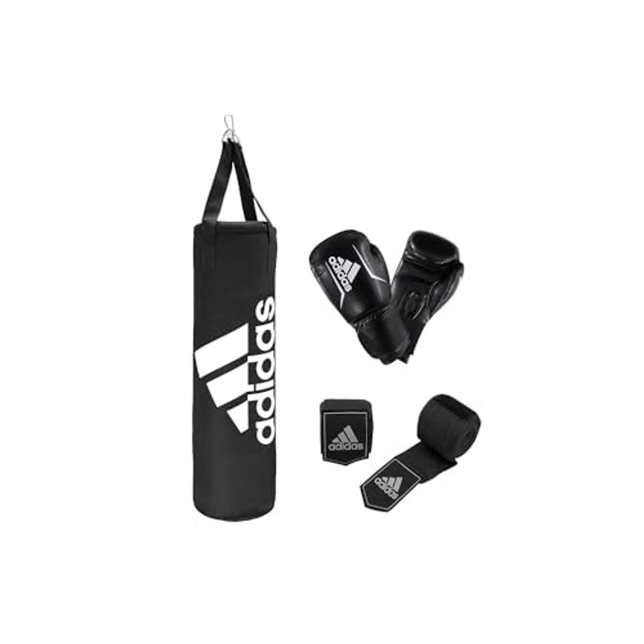 adidas Unisex Erwachsene Boxing Kit BoxsetDas Adidas Performance Boxing Set Das Komplettset für Ihr Workout - Das Adidas Performance Boxing Set besteht aus 1 Boxsack, 1 Paar Boxhandschuhen 10 oz und 1 Paar 2,55 m langen Bandagen für eine bessere Unterstützung der Hand und Handgelenke. Der Boxsack ist mit Textilien gefüllt und bekommt somit ein Gesamtgewicht von 18 kg. Dank der 4-Punkt Aufhängung lässt er sich leicht an der Decke befestigen.Für optimalen Halt an den Händen sind die Boxhandschuhe mit einem breiten Klettverschluss versehen. Hochwertige Nylon-Straps für die Befestigung sorgen für einen stabilen Bewegungsradius und einen geringeren Lärmpegel im Vergleich zu Stahlketten.