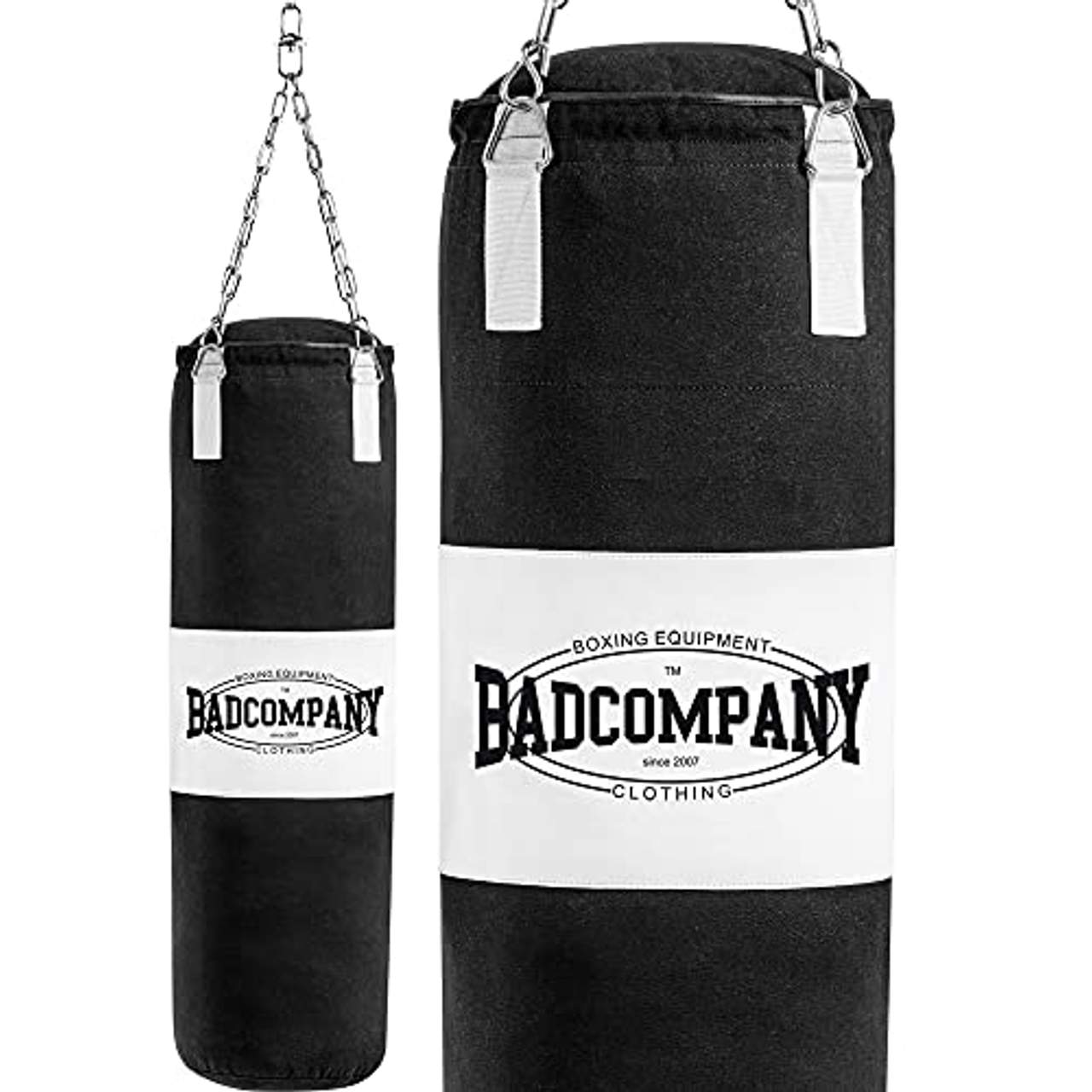 Bad Company Boxsack inkl. Heavy Duty Stahlkette I Canvas Punching Bag mit PVC-TargetBad Company Boxsack aus robustem Canvas mit Vierpunkt-Stahlkette und PVC-TargetDer Boxsack ist die ideale Lösung, um sich den Weg ins Fitnessstudio zu sparen. Dank der mitgelieferten Vierpunkt-Stahlkette lässt sich der Punchingsack direkt an der Decke befestigen. Für ein professionelles Box- oder Kickboxtraining im Homegym für Neueinsteiger oder Boxprofis geeignet.Boxen ist ein sehr umfangreicher Sport. Hierbei werden der komplette Körper sowie der Geist gleichermaßen trainiert und die Gesamtfitness gesteigert. Eigenschaften wie Beweglichkeit, Ausdauer, Kraft und Reaktionsvermögen werden durch das Training am Boxsack deutlich verbessert. Vor allem die Muskeln im Oberkörper, wie der Trizeps, Bizeps sowie die Schulter- und Rückenmuskeln werden effektiv gestärkt.Die ungefüllte Variante kann mit Stoffresten z. B. Filzreste, Reste von Kleidungsstücken befüllt werden (Füllanleitung ist im Lieferumfang enthalten).Qualitätsmerkmale:Gefertigt aus hochwertigem Canvas, einem reißfesten Leinengewebe