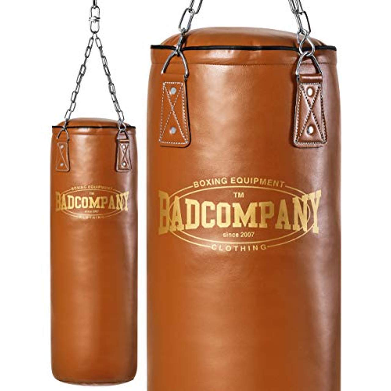 Bad Company Retro Boxsack I Punching Bag ungefülltBad Company Retro Boxsack aus hochwertigem Kunstleder inkl. Vierpunkt-StahlketteDer Boxsack ist die ideale Lösung, um sich den Weg ins Fitnessstudio zu sparen. Dank der mitgelieferten Vierpunkt-Stahlkette lässt sich der Punchingbag direkt an der Decke befestigen. Geeignet für ein professionelles Box- oder Kickboxtraining im Homegym für Neueinsteiger oder Boxprofis.Boxen ist ein sehr umfangreicher Sport. Hierbei werden der komplette Körper sowie der Geist gleichermaßen trainiert und die Gesamtfitness gesteigert. Eigenschaften wie Beweglichkeit, Ausdauer, Kraft und Reaktionsvermögen werden durch das Training am Boxsack deutlich verbessert. Vor allem die Muskeln im Oberkörper, wie der Trizeps, Bizeps sowie die Schultermuskeln und Rückenmuskeln werden effektiv gestärkt.Die ungefüllte Variante kann mit Stoffresten befüllt werden.Qualitätsmerkmale:Gefertigt aus hochwertigem, reißfestem Kunstleder