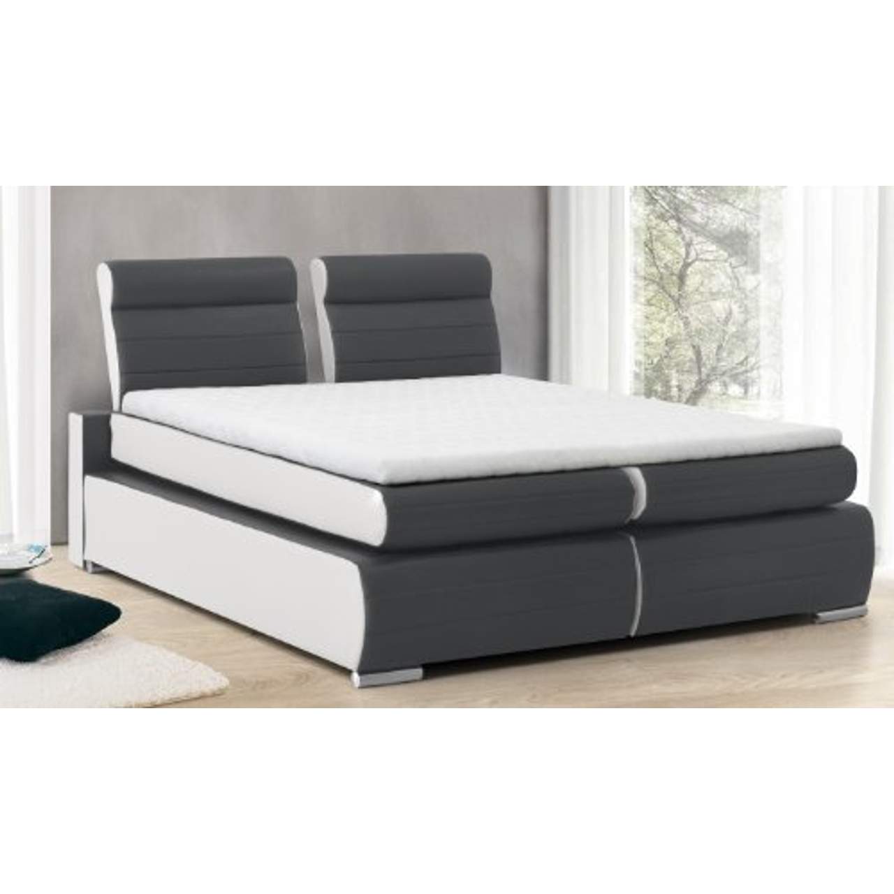 Collection AB Boxspringbett MonacoDas Boxspringbett Dilgry mit Topper besticht durch seine besondere Formensprache, die durch seitlich überstehende, nach vorn gerundete und weich gepolsterte Überbetten erreicht wird. Auch der Bezug aus farblich kombiniertem und sehr weichem PU Luxuskunstleder trägt zu dem außergewöhnlichen Design des Boxspringbettes bei.Besonderen Komfort bietet die Kombination von Unterbett Box, Visco-Elastic Komfort-Topper und zwei Obermatratzen. Die Unterbett Box ist mit einem Bonnell-Federkern auf Federholzleisten gepolstert, welcher luftdurchlässig ist und dadurch eine optimale Zirkulation und Klimaregulierung ermöglicht. Seitlich ist sie mit Stoff bezogen und auf der Oberseite mit Matratzendrell gesteppt.Der Komfort-Topper ist auch mit einem gesteppten Matratzendrell bezogen und besteht aus einem Schaum, der sich optimal der Körperform anpasst. Die Obermatratzen haben einen 7 Zonen Tonnen-Taschenfederkern und sind, genauso wie die Matratzen und der Topper, seitlich mit Stoff bezogen sowie auf der Ober- und Unterseite mit Matratzendrell gesteppt. Insgesamt wird dadurch ein 3-Fach Federungskomfort erreicht, der garantiert für besonders entspannte Nächte sorgen wird.Features: -Lieferumfang: Boxspringbett inkl. Füße, Box, Matratzen, Kopfteil und Topper…-Matratzenspiegel und Topper in Drell aus 100% PES.-Bezug aus farblich kombiniertem hochwertigem und sehr softem PU Luxuskunstleder.-Konstruktion mit Federholzleisten aus Holz und Holzwerkstoffplatten.-Obermatratzen mit 7 Zonen Tonnen-Taschenfederkern, seitlich mit Stoff bezogen, Ober und Unterseite mit Matratzendrell gesteppt.-Optimale Zirkulation und Klimaregulierung durch luftdurchlässigen Federkernaufbau.-3-Fach Federungskomfort.-Sehr gute und punktelastische Körperunterstützung.-Unterbett Box gepolstert mit Bonnell-Federkern auf Federholzleisten, seitlich mit Stoff bezogen und auf der Oberseite (Spiegel) mit Matratzendrell.-Visco-Elastic Komfort-Topper (Schaum der sich dem Körperform anpasst) mit gesteppten Matratzendrell bezogen.-Kopfteil mit PUR Schaum gepolstert, Kopfteile auch Rückseite mit Echtstoff bezogen.-Keine harten Kanten durch komplette Abpolsterung.-Farbe:.-Liegefläche: 180 × 200 cm.-Polstermaterial: Kunstleder -Details zum Polstermaterial: Bezug Obermaterial aus 100 % Polyurethan, Unterfüttert aus 100 % Baumwolle…-Gestellmaterial: Holzwerkstoff;Holz, teilmassiv -Details zum Gestellmaterial: …-Füllmaterial des Kopfteils: Schaumstoff und Polsterwatte -Zusammensetzung des Füllmaterials: …-Boxart: Bonellfederkern-Box.-Rahmenmaterial der Box: Holzwerkstoff.-Zusätzliche Boxmaterialien: .-Matratzenart: Tonnentaschenfederkernmatratze.-Härtegrad: H2 - ca. 60 kg bis 80 kg.-Bezugsmaterial der Matratze: Seiten aus Originalstoff + Spiegel aus Matratzendress.-Waschbarer Matratzenbezug: Nein -Waschanweisung Matratzenbezug: …-Topper inklusive (Farbe: Anthrazit / Weiß): Ja -Topperart: Viscoschaum-Topper.-Bezugsmaterial des Toppers: Matratzendrell.-Waschbarer Topperbezug: Ja.-Waschanweisung Topperbezug