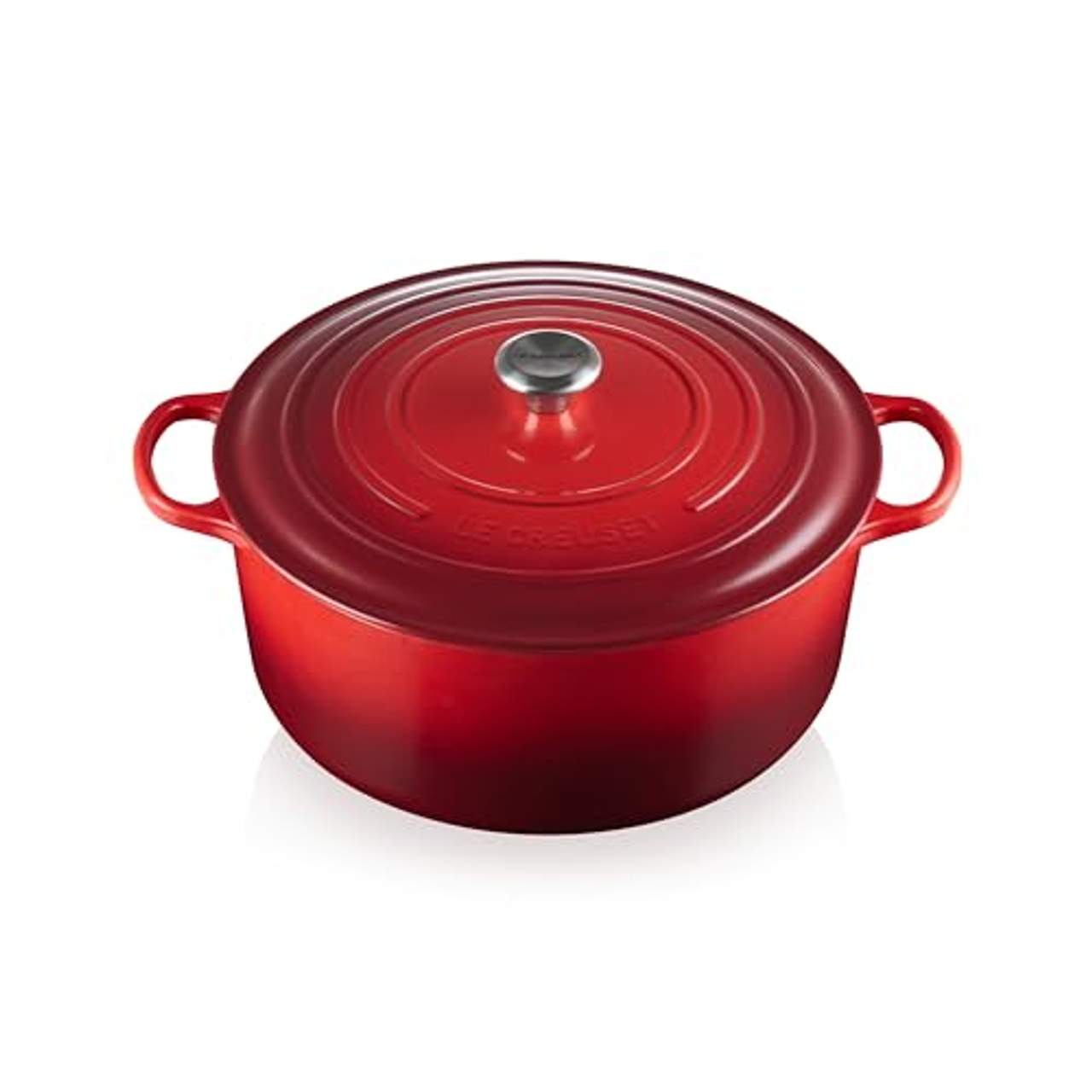 Dieser Le Creuset Signature Gusseisenbräter ist ein runder, kirschroter Topf mit einem Fassungsvermögen von 12,6 l und einem Durchmesser von 34 cm. Er zeichnet sich durch energieeffizientes Kochen mit gleichmäßiger Wärmeverteilung vom Boden bis zu den Seitenwänden sowie durch einfache Reinigung per Hand oder in der Spülmaschine aus. Der Deckel besteht aus emailliertem Gusseisen und ist mit einem Edelstahlknauf ausgestattet, der für zusätzliche Sicherheit beim Anheben und Tragen sorgt. Dieses Produkt wird in Frankreich hergestellt und ist für alle Herdarten geeignet, auch für Induktion.