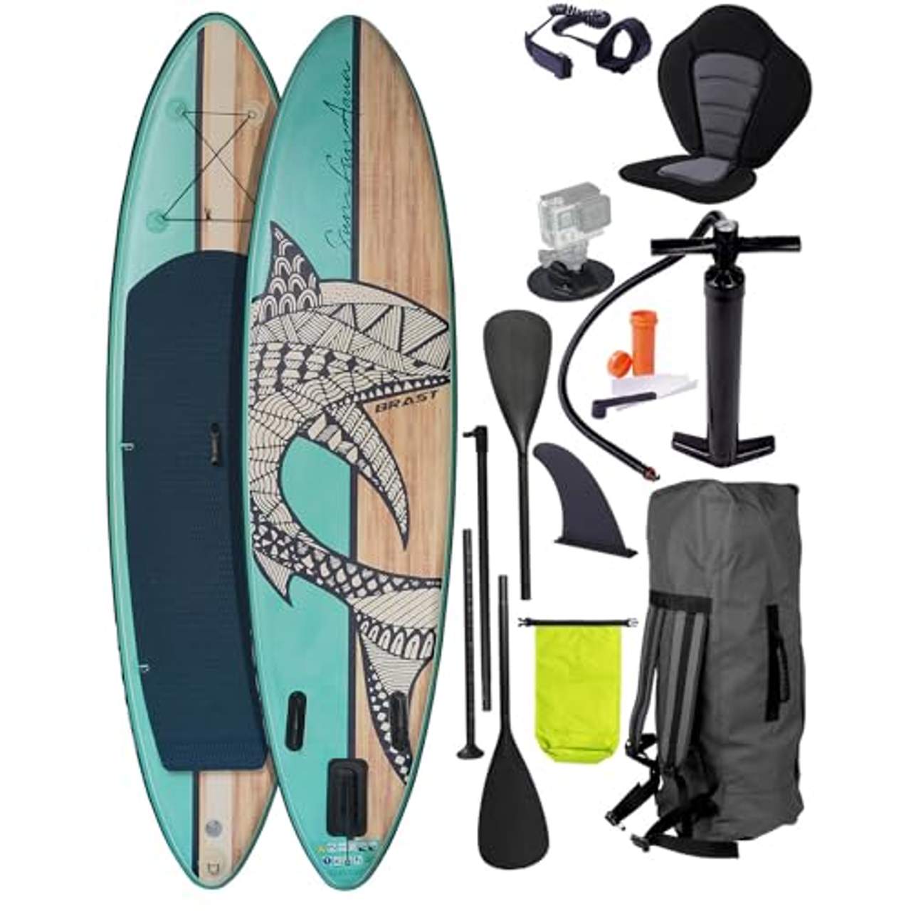 Das BRAST SUP Board Retro besticht durch seine einzigartige Mischung aus moderner Technologie und Vintage-Design und bietet sowohl Stabilität als auch Stil für Paddleboarding-Enthusiasten. Besonders gut gefällt uns die fortschrittliche Drop Stitch-Konstruktion, die für Steifigkeit ohne übermäßiges Gewicht sorgt und das Handling auf verschiedenen Gewässern verbessert. Mit der Auszeichnung „Höchste Kundenzufriedenheit 2024“ kommt dieses Board bei den Nutzern sehr gut an. Wichtige Merkmale wie das 2-in-1-Kajakpaddel und die rutschfeste Oberfläche erhöhen die Vielseitigkeit und den Komfort. Sein umfangreiches Zubehör, darunter ein abnehmbarer Kajaksitz und eine GoPro-Halterung, machen es noch praktischer. Mit einer robusten Fünf-Jahres-Garantie und exzellentem Nutzerfeedback wird das BRAST SUP Board Retro zu einer überzeugenden Option in deinem persönlichen BRAST SUP Board Test.