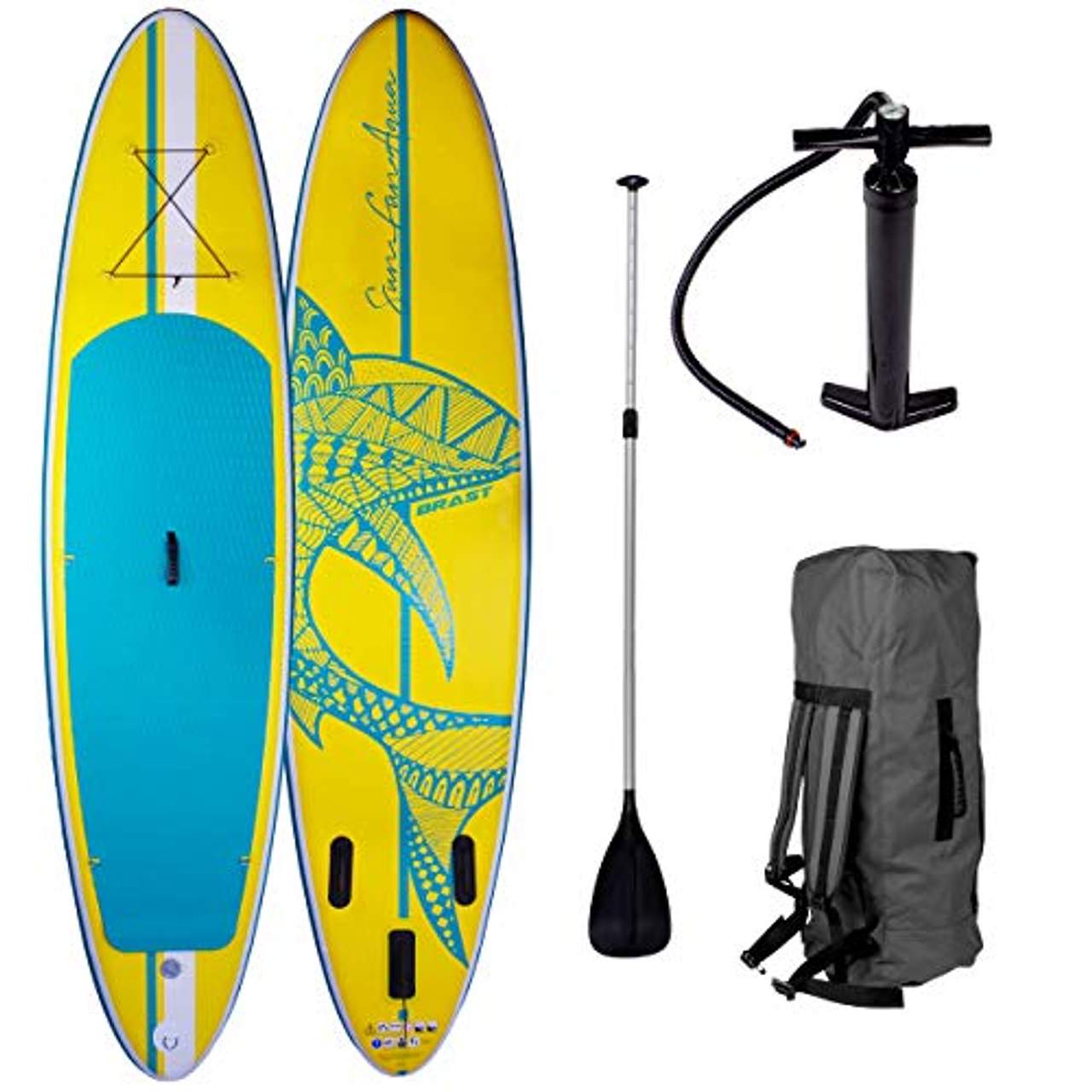 - Komplettes Paket: Dieses Produkt beinhaltet das BRAST SUP Board "Shark", Teleskop-Aluminium-Paddel (3 Stück zerlegbar) mit T-Griff, Transportrucksack aus strapazierfähigem Polyester, Hochdruck-Handpumpe mit Manometer und Reparatur-Kit - alles, was Sie brauchen, um loszulegen!