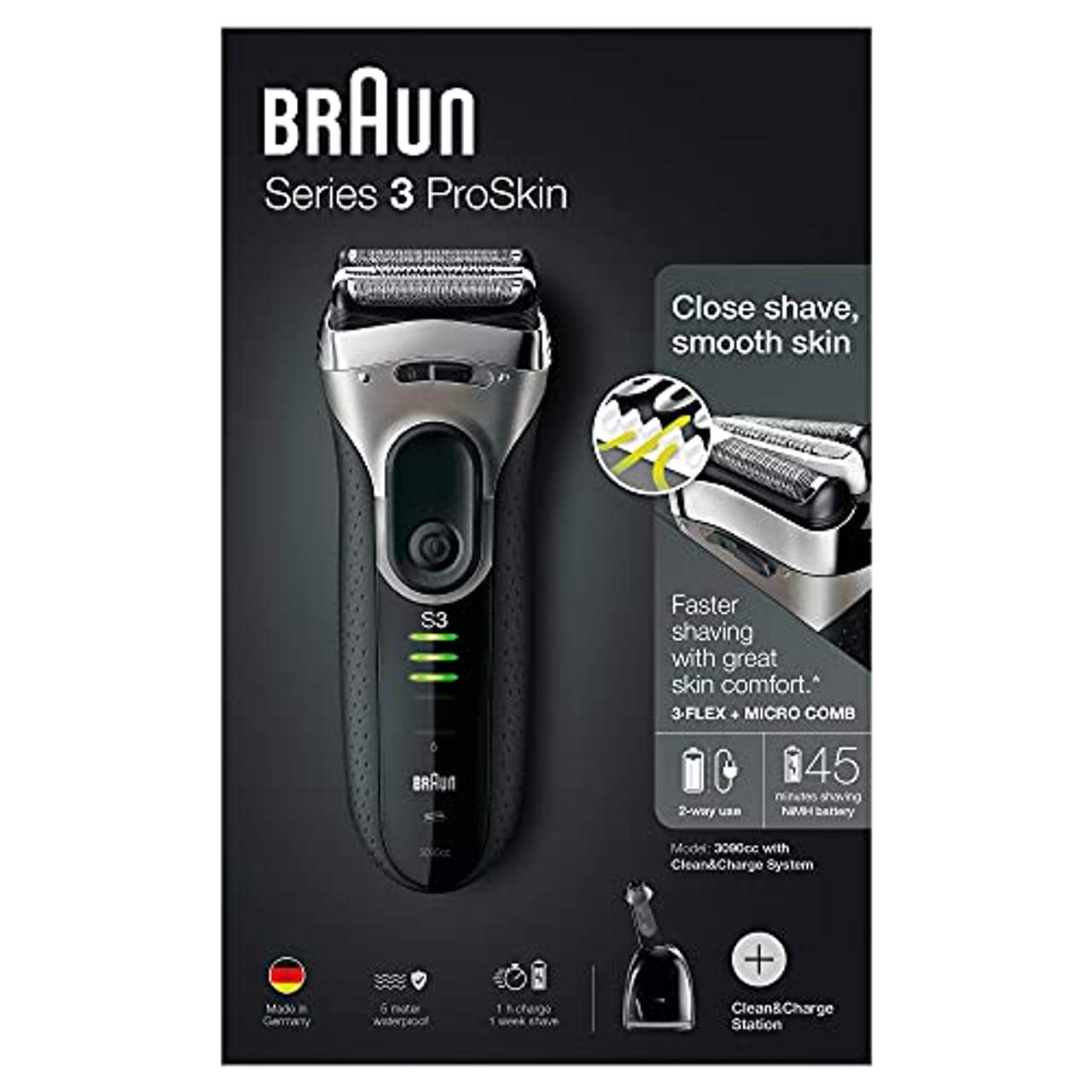 Braun Series 3 ProSkin 3090cc elektrischer RasiererSeries 3 - 3090cc Wet&Dry Rasierer inkl. Reinigungsstation von Braun Braun Series 3 - 3090cc Wet&Dry Herrenrasierer inkl. Reinigungsstation Mit dem neuen Series 3 präsentiert Braun seine neue MicroComb Technologie: Zwei Reihen feiner Rillen in gleichmäßigen Abständen umgeben den unabhängig beweglichen Mitteltrimmer. Damit werden mit jedem Zug mehr Haare erfasst und den Scherelementen zugeführt; was die Rasur schneller macht.Der Unterschied zu anderen Rasierern ist deutlich spürbar; besonders beim Härtetest auf 3-Tage-Bärten. Langes und kurzes Barthaar in nur einem Zug effektiv schneiden 3-fach-Schersystem. Durch die perfekte Zusammenarbeit der doppelten Scherfolie mit dem integrierten unabhängig beweglichen Mitteltrimmer mit MicroComb Technologie werden Haare zunehmend kurz geschnitten.Sogar an schwierigen 3-Tage-Bärten erfolgreich getestet, schneidet das 3-fach-Schersystem sowohl lange als auch kurze Haare in jedem Zug. Mitteltrimmer: schneidet problemlos selbst längere und schwierige Haare. 2x SensoFoil: für perfekte Gründlichkeit; die länger hält. Flexible Scherelemente Passen sich den Gesichtskonturen an und erfassen lange wie kurze Haare mit jedem Zug.Triple Action Free Float System: Drei voneinander unabhängig bewegliche Scherelemente passen sich jeder Gesichtskontur an und bieten so ein sanftes Rasurerlebnis. 100 % wasserdicht Unter der Dusche rasieren, oder mit Schaum oder Gel. Die Wet&Dry Modelle des Braun Series 3 Rasierers wurden speziell entwickelt, um sie auch unter der Dusche1 oder mit Schaum oder Gel2 benutzen zu können. Für eine erfrischende Rasur ohne Kompromisse bei der Leistung. Unter fließenden Wasser abspülen Der Braun Series 3 ist IPX7 zertifiziert - er könnte problemlos bis zu 5 Meter tief in Wasser getaucht werden. Umso einfacher kann er natürlich bequem unter fließendem Wasser gereinigt werden. Clean&Charge Station mit Dreifachwirkung auf Alkoholbasis Die einzige Reinigungs- und Ladestation der Welt mit Dreifachwirkung auf Alkoholbasis reinigt hygienisch, pflegt und lädt den Rasierer auf.Die Reinigungs- und Ladestation, die 99,999 % aller Keime entfernt, ist 10x hygienischer als nur fließendes Wasser. Präzisionsmodus für schwierige Stellen Der Braun Series 3 hat einen sehr cleveren Präzisionsmodus: Mit einem einfachen Schalter kann eine der beiden Scherfolien zeitweise eingezogen werden. Dadurch wird der aktive Teil des Scherkops deutlich schmaler, für eine einfachere präzise Rasur. Das ist besonders hilfreich beim erreichen schwieriger Stellen wie unter Kinn oder Nase.Wiederaufladbare Ni-MH-Batterie Komplette Aufladung innerhalb von 1 Stunde, während eine schnelle 5-minütige Aufladung für 1 Rasur reicht. Das 6-teilige LED-Display3 zeigt den Batterie- und Hygienezustand und warnt vor niedriger Ladung. Je nach Modell Akku- oder Netzbetrieb. Gummierte Griffzone für sichere Bedienung auch in nassem Zustand. Langhaarschneider für präzisere Konturierung von Schnurrbart und Koteletten.Technische Daten Akku Laufzeit ca. 50 min. Akku Ladedauer ca. 1 Std. 45 Minuten Schnellladung für eine Rasur: 5 min. 3-fach Schersystem beweglicher Scherkopf Präzisionstrimmer Batterieanzeige: LED Batterieanzeige (4 Stufen) Reinigungsstatus Reisesicherung Reinigungsstation Akku: NiMh Akkubetrieb Automatische Spannungsanpassung Farbe: Schwarz Lieferumfang Braun Series 3 - 3090cc Wet&Dry Rasierer inkl. Reinigungsstation Reiseetui