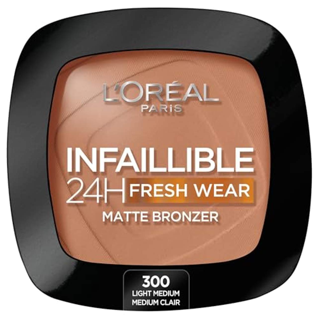 Der L'Oréal Paris langanhaltender und deckender Bronzer ist im Farbton 300 Light Medium erhältlich, der zu verschiedenen Hauttönen passt und für eine natürlich aussehende Bräune sorgt.
