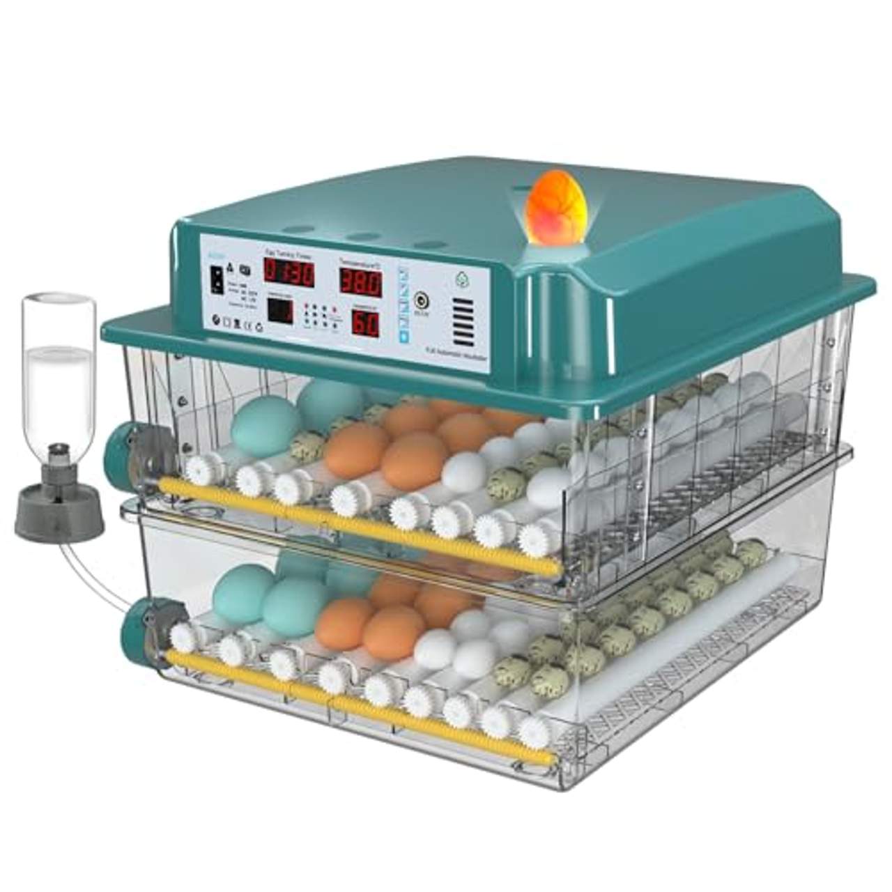 Die eingebaute Eierlampe ist eine fantastische Funktion, um befruchtete Eier effektiv zu überwachen. Mit dieser Lampe kannst du die Entwicklung des Embryos während der gesamten Inkubationszeit leicht beobachten. So kannst du effizienter prüfen, ob die Embryonen lebensfähig sind, und sie hilft dir auch, unfruchtbare oder sich nicht entwickelnde Eier frühzeitig zu erkennen, was für die Erhaltung der Gesundheit der Eier entscheidend sein kann.