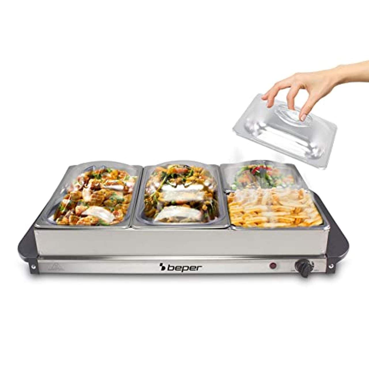BEPER P101TEM001 Buffetstövchen Stahlbeper Buffet-Speisenwärmer P101TEM001 Warmhalter 300W Wärmebehälter, Speisewärmer, Chafing-Dish, Warmhalteplatte, Heizplatte Der beper Buffet-Speisenwärmer hilft, Speisen warm zu halten, ohne sich Gedanken über das Anbrennen machen zu müssen. Ideal für Familienfeiern, persönliche Feiern, formelle Veranstaltungen und Partys.Zwei abnehmbare 2-Liter- und zwei 1,1-Liter-Stahlschüsseln ermöglichen es Ihnen, verschiedene Mahlzeiten separat zu servieren. Ein transparenter Deckel verdeckt den Inhalt. Wenn die Schalen entfernt werden, verwandelt sich der Boden in eine große Grillplatte, um Speisen direkt aus der Pfanne heiß zu halten.Der isolierte Griff erleichtert den Transport des Speisewärmers. Ausgestattet ist dieser mit einem Thermostat zur Temperaturregulierung und einer Betriebsanzeige. Schalen und Deckel sind spülmaschinenfest. Artikelmerkmale: - beper Buffet-Speisewärmer - Leistung: 300Watt - Temperaturregulierung mit Betriebsanzeige - 2 x 2 Liter Stahlschüsseln (abnehmbar) inkl. transparenten Deckeln - 2 x 1,1 Liter Stahlschüsseln (abnehmbar) inkl. transparenten Deckeln - ohne Schalen dient der Speisewärmer als Warmhaltplatte - spülmaschinenfeste Schalen und Deckel Maße und Gewicht: - Maße: 64 x 36 x 4 cm (L x B x H) - Gewicht: 4,48kg Lieferumfang: - beper Buffet-Speisewärmer - 2 x 2 Liter Stahlschüsseln inkl. Deckeln - 2 x 1,1 Liter Stahlschüsseln inkl. Deckeln - Bedienungsanleitung Weitere Hinweise beper Buffet-Speisewärmer - Leistung: 300Watt Temperaturregulierung mit Betriebsanzeige 2 x 2 Liter Stahlschüsseln (abnehmbar) inkl. transparenten Deckeln 2 x 1,1 Liter Stahlschüsseln (abnehmbar) inkl. transparenten Deckeln ohne Schalen dient der Speisewärmer als Warmhaltplatte Unsere Entsorgungshinweise zu Batterien und Elektrogeräten finden Sie auf https://www.yomonda.de/c/entsorgungshinweise.html
