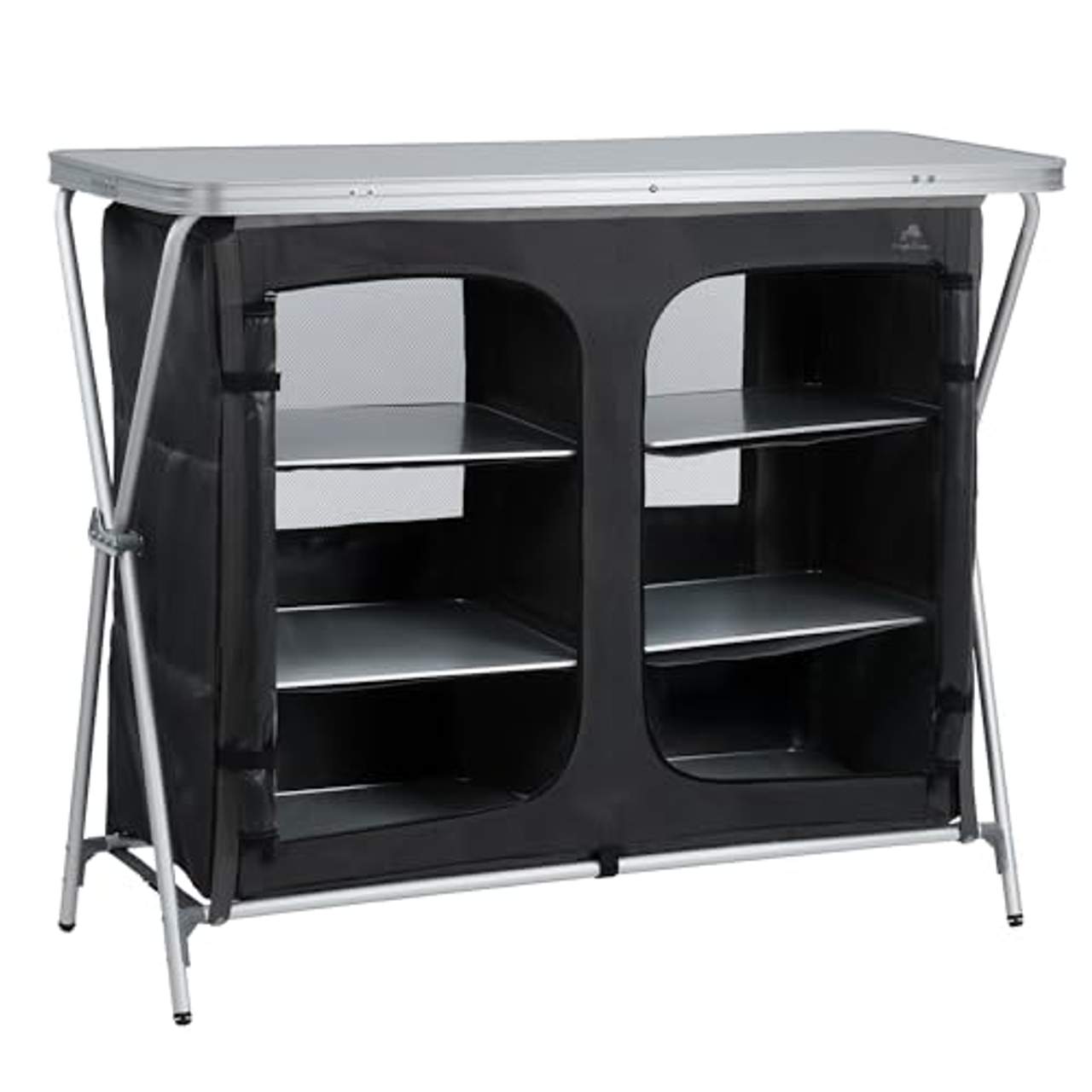 CampFeuer Campingschrank faltbar 110 cm x 47 cm x 90 cmCampFeuer Campingschrank, 110 cm x 47 cm x 90 cm, Campingküche Alu Faltschrank, Camping Möbel Der Camping Küchenschrank eignet sich ideal für Camping und Outdoor-Aktivitäten. Dank des einfachen Auf- und Abbaus kann der Schrank flexibel eingesetzt werden, zum Beispiel im Zelt, auf Partys, Flohmärkten, Garagen, Werkstätten, im Garten oder auf dem Balkon.Mit den vielen Ablageflächen und Stauräumen bietet der Camping Faltschrank genügend Stauraum für Ihre Kochutensilien und Vorräte. Auf der großen Arbeitsfläche lassen sich die verschiedensten Gerichte einfach vor- und zubereiten. Der Outdoor Camping Schrank wird in einer praktischen Transporttasche geliefert und kann jederzeit wieder platzsparend verstaut werden.Somit ist die leichte Campingküche der perfekte Reisebegleiter. Die Schrankeinsätze haben an der Rückseite Moskitonetze. So kann die Luft hervorragend zirkulieren, aber ungebetene Gäste, wie Insekten, können Ihre Vorräte nicht erreichen. Dank der verstellbaren Füße können Sie das Campingregal an unebene Untergründe anpassen, so steht der Schrank stets stabil.Die Stoffabdeckungen des Stauraums können mithilfe der Reißverschlüsse nach Belieben geöffnet und verschlossen werden. So schützen Sie Ihre Utensilien vor der Sonne und neugierigen Blicken. Highlights - Ideal geeignet für Camping, Outdoor, Garten - Außenmaß: (B) 110 cm x (T) 47 cm x (H) 90 cm - Packmaß: (B) 112 x (T) 13 x (H) 56 cm - Belastbarkeit Arbeitsfläche: 30 kg - Belastbarkeit Einlegeboden: 20 kg - Material Gestell: Aluminium - Material Ablagen: Kunststoff - Material Stoffeinsatz: 600D PVC - Farbe: schwarz - silber - 2 große Stauraumfächer mit je 3 Einlegeböden - Schneller Auf- und Abbau - Leicht zu transportieren - Platzsparend - Textilkennzeichnung: 100% Polyester - Lieferumfang: 1x Campingküche, 1x Tragetasche