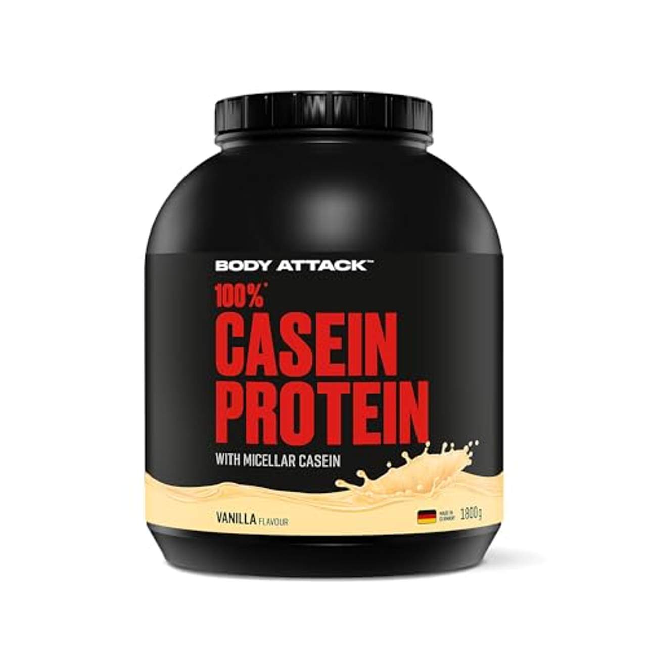 Body Attack 100% Casein Protein100% Casein Protein Pulver von Body Attack mit Vanilla Cream Geschmack. 100% Casein Protein von Body Attack Das 100% Casein Protein von Body Attack ist eine hochwertige Mischung aus Calcium-Caseinat und mizellarem Casein. Mit einem Proteinanteil von ca. 90% ist es optimal für den Muskelaufbau und Diätphasen geeignet.Da Casein nur langsam vom Körper aufgenommen wird, dient das 100% Casein Protein von Body Attack vor allem als „Night-Time-Protein“. Damit kannst du deinen Körper die Nacht über mit wichtigen Aminosäuren versorgen. Weiterhin zeichnet sich das 100% Casein Protein von Body Attack mit einem geringen Fett- und Kohlenhydratanteil aus, was es für eine Low Carb- und Low Fat-Ernährung eignet.100% Casein Protein - 1800g - Vanilla Cream hat die PZN 04078364.