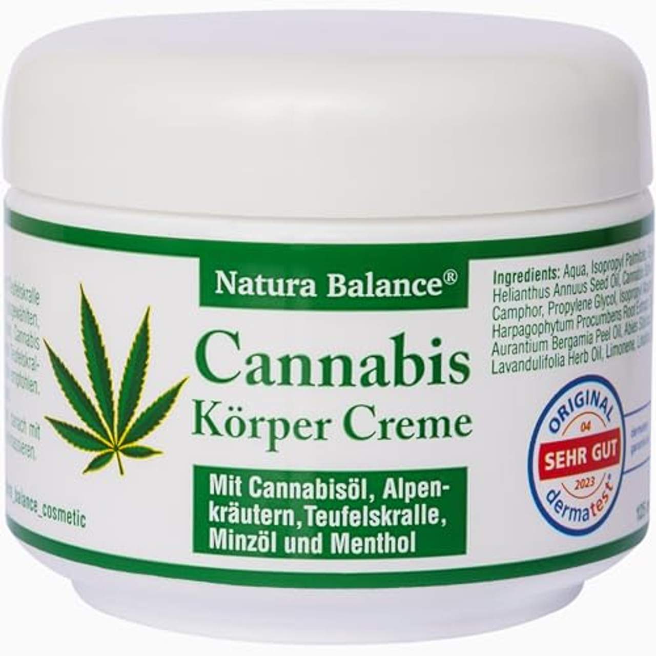 3 Dosen a 125ml Cannabis Creme3 Dosen a 125 ml NATURA BALANCE Cannabisöl mit natürlichen Alpenkräutern, Minzöl, Menthol und Teufelskralle Balsam. Dermatologisch getestet durch DERMATEST Münster ,04/2023. Testurteil : sehr gut. Apotheken PZN 18831167 Kosmetikum CPNP 4296290 Die Creme wird für müde, schmerzende oder entzündete Körperteile empfohlen. Ideale Haut- und Muskelpflege für Sport- und Reflexmassagen. Kühlend durch Menthol &, Minzöl für beanspruchte Muskeln z.B. in Beinen, Schultern oder Rücken. Die Kraft der Natur, aus den ältesten tradionellen Pflanzen. Unseren Experten im Labor ist eine perfekte Rezeptur gelungen. Die Cannabis Creme mit Hanföl und Teufelskralle ist eine optimale Mischung aus sorgflltig ausgewählten , traditionellen Kräutern aus den Alpen, Cannabisöl und dem in Afrika beliebten und weit verbreiteten Teufelskrallen-Extrakt. Das wertvolle Cannabisöl aus der Hanfpflanze, kann bei Gelenkschmerzen hilfreich sein. Seine entzündungshemmenden und beruhigenden Fähigkeiten gelten als äußerst wohltuend.In der Medizin wird Cannabis schon länger erfolgreich bei Schmerzen eingesetzt. Cannabis Creme enthält nicht das berauschende THC und ist daher absolut frei von Nebenwirkungen jeglichen Suchtpotenzials und natürlich völlig legal. Durch das muskelpflegende Menthol und Minzöl wird die Wirkung des Cannabisöls perfekt ergänzt.Die Cannabis Creme einfach auf die entsprechenden Muskelpartien an Knie, Bein, Rücken, Nacken, Hüfte, Arme, Ellenbogen und Schultern aufgetragen. Diese Creme fühlt sich nicht fettig an, sie zieht schnell ein, ohne Flecken auf der Haut oder Kleidung zu hinterlassen und ist leicht kühlend.Hergestellt in Deutschland. Gesamt 3 Dosen je 125ml =, 375 ml