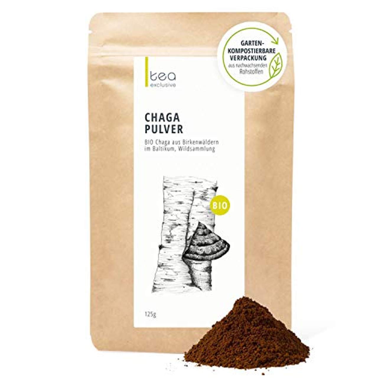 Chaga Pilz Pulver Wildsammlung BIOUnser Chaga Pilz stammt aus Estland, dem Land der Birken, und wächst dort in den heimischen Wäldern wild und unberührt. Die Ernte des Chaga Birkenpilzes erfolgt sorgfältig von Hand unter Beachtung des Alters (mind. 5 Jahre) und der Wuchshöhe (mind. 10 bis 15 Meter). Chaga Pilz (lat. inonotus obliquus, Schiefer Schillerporling oder Chaga-Birkenpilz) wächst in der Nähe des Polarkreises an Birken und ist in skandinavischen Ländern seit Jahrhunderten im Einsatz.Die besten Chaga Birkenpilze gedeihen besonders gut bei sehr niedrigen Temperaturen.Die für das Chaga Pilzpulver geernteten Chaga Pilze wachsen wild und unberührt für mindestens fünf Jahre und haben so ausreichend Zeit, ihren vollen Nährstoffgehalt auszubilden. Die Ernte erfolgt ausschließlich von lebenden Birken per Hand.Dann werden die Birkenpilze bei 30-35°C schonend getrocknet (Rohkost-Qualität) und zu feinstem Pulver vermahlen.Was ist Chaga?Chaga Pilz gilt in der traditionellen Volksmedizin skandinavischer Länder, sowie in Russland seit Jahrhunderten als Heilpilz. Er wurde fast immer als Chaga Tee getrunken. Wissenschaftliche Studien, die eine tatsächliche Wirkung des Pilzes beim Menschen belegen, gibt es allerdings nicht.Dennoch glauben auch heute noch viele Menschen an die Kraft des Chaga Pilzes. Das Chaga Birkenpilz Pulver lässt sich vielseitig anwenden.Verzehrempfehlung:Täglich 1 TL (ca. 2,2g) einnehmen, z.B. in Smoothies, Müsli, Joghurt oder in einen Teebeutel geben, mit kochendem Wasser aufgießen und 15 Minuten ziehen lassen. Tipp: Bio- und Rohkostqualität. Geschmack: Mild-erdig, leichte Vanillenote. Verkehrsbezeichnung: Chaga Pilz Artikelbezeichnung: Chaga Pilz Pulver aus Wildsammlung BIO, 125g Marke:tea exclusive