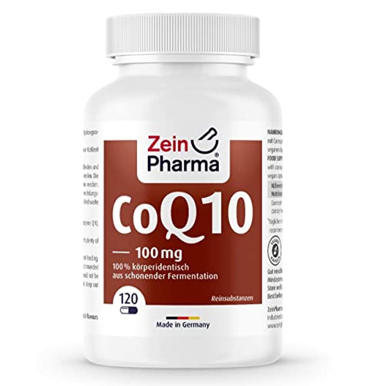 Zein Pharma Coenzym Q10 Kapseln 100 mgNahrungsergänzungsmittel sind kein Ersatz für eine ausgewogene und abwechslungsreiche Ernährung und eine gesunde Lebensweise. Coenzym-Q10-Kapseln 100 mg von ZeinPharma (120 Kapseln) Entdecken Sie die positiven Eigenschaften des Coenzyms Q10. Die Coenzym-Q10-Kapseln von ZeinPharma enthalten dieses in einer 100 Prozent natürlichen Form, welche nahezu identisch mit dem Körpereigenen Coenzym ist.So können Sie sich die positiven Eigenschaften von Q10 dauerhaft zunutze machen. • Beinahe identisch zu körpereigenem Q10 • Hohe Konzentration • Pflanzliche Basis • Hergestellt in Deutschland Coenzym-Q10-Kapseln zur Unterstützung der Enzym-Funktion Das Coenzym Q10, welches in der Fachsprache auch als 'Ubichinon“ bezeichnet wird, soll in beinahe jedem Gewebe des menschlichen Körpers vorkommen. Hier wird dem Coenzym die wichtige Aufgabe zugesprochen, andere Enzyme bei physiologischen Reaktionen und komplexen Prozessen zu unterstützen. Damit kann sich das Coenzym Q10 beispielsweise positiv auf die Energiegewinnung und das Immunsystem auswirken.Außerdem kann Coenzym Q10 Ihre Zellen auch im Kampf gegen freie Radikale unterstützen. Grundsätzlich ist der menschliche Organismus dazu fähig, selbst ausreichend Q10 zu produzieren. Allerdings soll sich diese Fähigkeit mit steigendem Lebensalter zunehmend verschlechtern. Daher gilt es als wichtig, spätestens ab dem 40.Lebensjahr eine ausreichende Q10-Zufuhr zu gewährleisten. Mit den Coenzym-Q10-Kapseln kaufen Sie ein natürliches und hochkonzentriertes Nahrungsergänzungsmittel, mit dem Sie dauerhaft eine ausreichende Q10-Versorgung gewährleisten können. Zutaten: Füllstoff: mikrokristalline Cellulose, Coenzym Q10 (20,8 %), Kapselhülle: Hydroxypropylmethylcellulose (Hpmc), Trennmittel: Magnesiumsalze der Speisefettsäuren (pflanzlich). Nährwerte: Durchschnittliche Nährwerte: pro 1 Kapsel* Coenzym Q10 100 mg *Täglich empfohlene Verzehrmenge Verzehrsempfehlung: Täglich unzerkaut 1 Kapseln während oder nach einer Mahlzeit mit viel Wasser oder Saft verzehren. Aufbewahrung: Gut verschlossen, kühl und trocken lagern. Außerhalb der Reichweite von kleinen Kindern aufbewahren. Nettofüllmenge: 120 Kapseln = 57,5 g Herstellerdaten: ZeinPharma Germany GmbH Industriestr. 29 64569 Nauheim