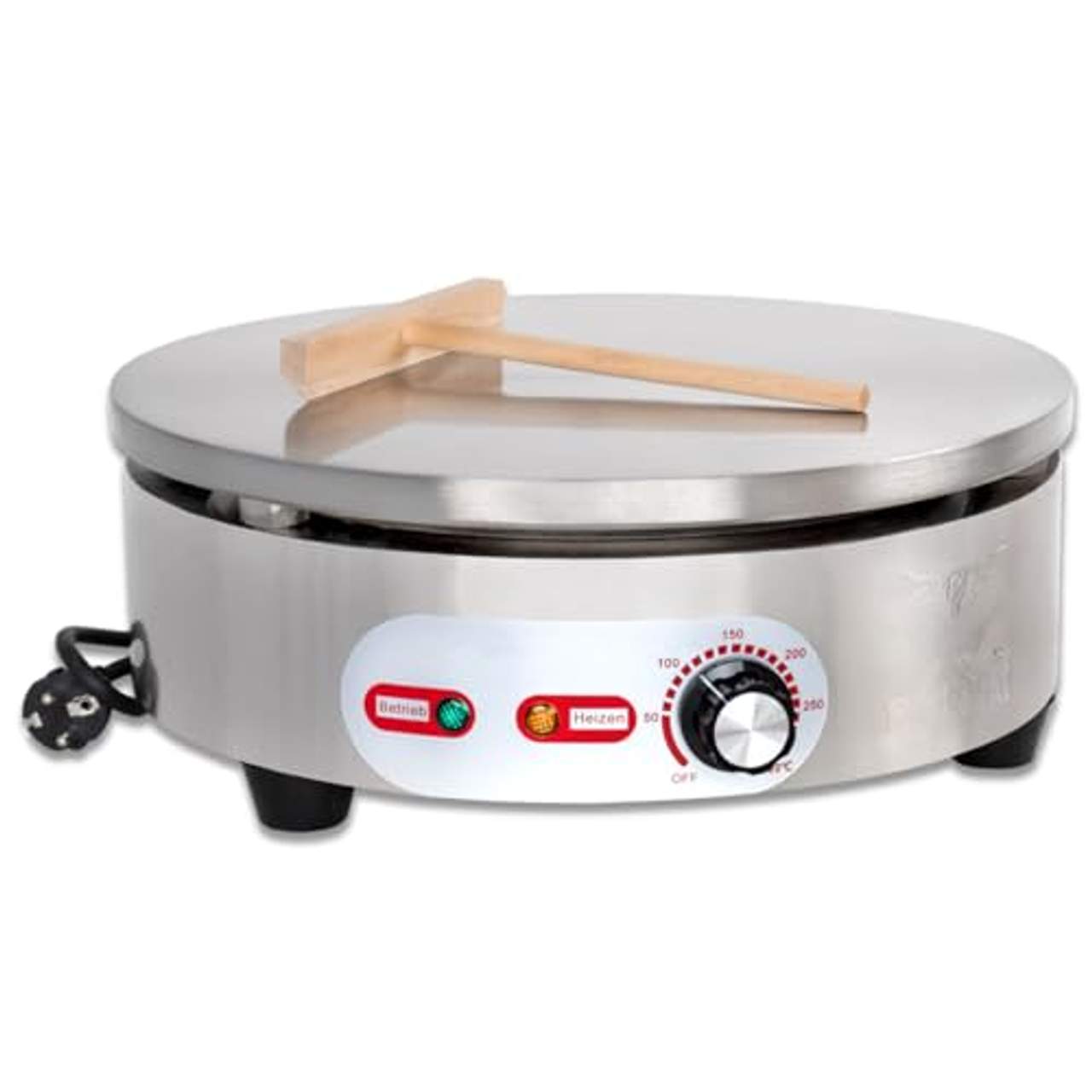 Beeketal 'BC40-1R' Gastro Crepes MakerBeeketal Profi Crepes Maker BC40-1R im Edelstahl Gehäuse mit einer Ø 400 mm antihaftbeschichteten Crepesplatte aus Gusseisen, inkl. TeigverteilerDer Beeketal Crepes Maker wurden speziell für den Einsatz in der Profi Gastronomie entwickelt. Ideal für Gaststätten, Cafe´s, Eisdielen oder Verkaufswägen auf z.B. Weihnachtsmärkten oder Volksfesten. Die Crepes Maschine eignet sich aber auch für den ambitionierten Pfannekuchen Profi in der heimischen Küche. Die Profi Crepes Platte oder auch Crêpière genannt, zeichnen sich durch Ihre einfache Bedienung und hochwertige Verarbeitung aus. Ein Gehäuse aus rostfreiem Edelstahl und eine antihaftbeschichtete Platte aus massivem Gusseisen und die stufenlos einstellbare Temperatur von 50 - 300° C sprechen für sich.