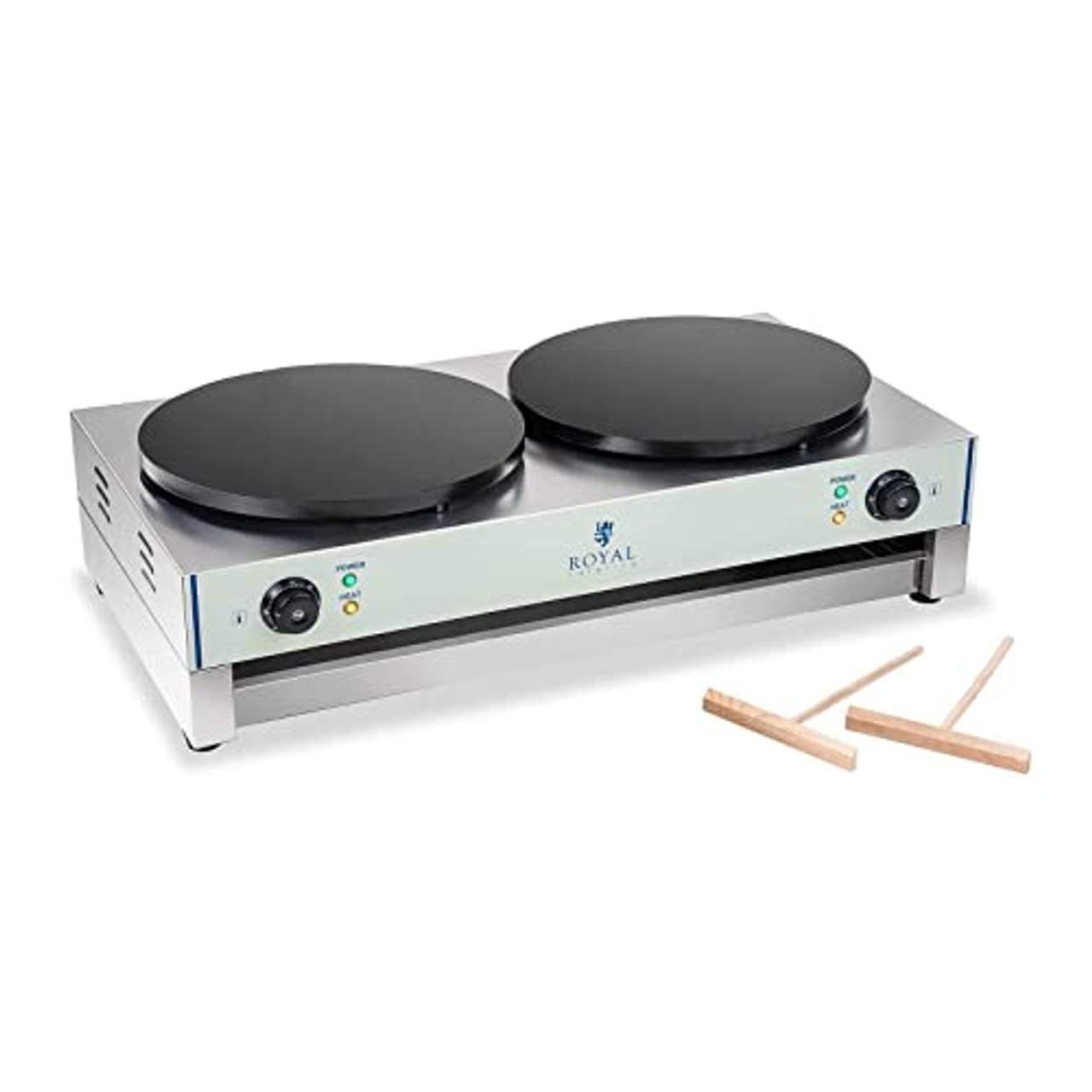 Royal Catering RCEC-6000-E Crepes Maker Profi Crepeseisen DoppeltDer leistungsstarke Crepes-Maker mit zwei Heizplatten von Royal CateringDie Royal Catering RCEC-6000-E Crepes-Maker-Maschine eignet sich ideal für Restaurants, Cafés oder Heimküchen. Das simple Backgerät erleichtert das Zubereiten leckerer runder Crêpes, die anschließend süß oder herzhaft serviert werden können. Die zwei Heizplatten ermöglichen das Zubereiten zweier Crêpes zur gleichen Zeit. Der Crepes-Maker RCEC-6000-E ist kinderleicht in der Bedienung und Handhabung - das macht ihn zu einem beliebten Gerät in Profi- und Heimküche. Über einen Temperaturregler lassen sich die Heizplatten einschalten sowie die gewünschte Temperatur, zum Backen von Crêpes oder Pfannkuchen, regulieren. Sobald der Crepes-Maker die richtige Temperatur erreicht hat, leuchtet die Bereitschaftsanzeige auf.Das effiziente Heizgerät mit einer Leistung von jeweils 3.000 Watt pro Heizplatte erwärmt sich in kürzester Zeit. Der Teig kann dann gleichmäßig auf die aus Gusseisen gefertigte Heizplatte aufgetragen werden. Diese misst einen Durchmesser von 40 cm und bietet dadurch einen großzügigen Spielraum. Mitgeliefert werden zwei cleverer Teigverteiler aus Holz. Unter der Platte befindet sich ein herausziehbares Edelstahlfach, hier können Küchenutensilien oder auch fertige Crêpes platzsparend gelagert werden.Technische DetailsMaterial Gehäuse: Edelstahl