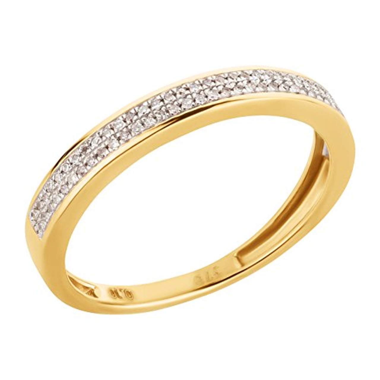 Dies ist ein hochwertiger Damenring der Marke Ardeo Aurum. Es ist aus 375 Gold Gelbgold gefertigt und hat zwei Reihen von natürlichen und unbehandelten Diamanten mit Farbe H und Klarheit P1. Der Ring ist 3 mm breit und wird mit einer Schmuckschatulle und einem Ausweis geliefert, in dem die Details und die Echtheit des Stücks beschrieben sind. Er enthält mehr Goldgehalt als 333er Gold.