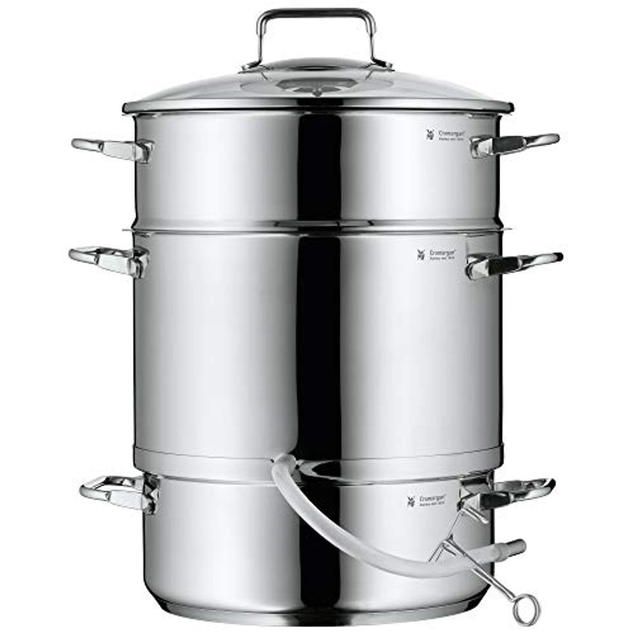 WMF Entsafter DampfentsafterWMF Entsafter Dampfentsafter Induktion 7l, Fruchtentsafter mit Glasdeckel 25 cm, Cromargan Edelstahl poliert - Inhalt: 1x Dampfentsafter Edelstahl mit Deckel (Ø 25cm, V 7l, H 40 cm), 1x Fruchtkorb (gelochter Dämpfereinsatz), 1x Saftkorb, 1x Unterteil, 1x Ablaufschlauch mit Edelstahlklemme - Art.Nr.: 0797809990 - Material: Cromargan Edelstahl Rostfrei 18/10 - spülmaschinengeeignet, pflegeleicht, backofengeeignet, geschmacksneutral und säurefest. Silikon. Hitzebeständiges Glas - Beim Entsaften im Dampf werden Lebensmittel nicht gekocht, sondern nur erhitzt, so bleiben Aroma, Farbe und Geschmack erhalten - ideal zur eigenen Verarbeitung von Obst/ Gemüse zu Saft, Marmelade uvm. - Die Bodenkonstruktion (TransTherm) sorgt für eine gleichmäßige und lange Wärmespeicherung - dies ermöglicht eine schonende Entsaftung von unterschiedlichen Obst- und Gemüsesorten - Der Entsafter Topf kann auf allen gängigen Herdarten verwendet werden: Induktionsherd, Gasherd, Elektroherd und Glaskeramikherd. Die verschiedenen Module können auch einzeln verwendet werden Praktischer Dampfentsafter Edeltstahl für jeden Haushalt für die eigne Zubereitung von Säften, Marmeladen, Fruchtgelees oder Kompott!Frucht- und Gemüsesäfte sind wahre Power Drinks, schmecken lecker, spenden Energie und stärken die Abwehrkräfte. Mit dem WMF Entsafter Dampfentsafter können Sie auf schonende Art aus Früchten oder Gemüse Saft gewinnen. Der WMF Entsafter aus Cromargan Edelstahl rostfrei 18/10 ist geschmacksneutral, beständig gegen Speisesäuren, hygienisch, pflegeleicht und für die Spülmaschine geeignet. Zudem ist der Entsafter mit einem TransTherm -Allherdboden ausgestattet und somit für alle Herdarten (auch Induktion) geeignet, hat ergonomische Griffe und einen Güteglasdeckel zum Sichtkochen.Mit dem WMF Entsafter können Sie Früchte ohne Konservierungsstoffe und chemische Zusätze verarbeiten. Beim Entsaften im Dampf werden die Früchte nicht gekocht, sondern nur erhitzt, so bleiben Aroma, Farbe, Geschmack, Mineralien und Vitamine erhalten. Der moderne, platzsparende Entsafter mit ergonomischen Griffen überzeugt durch die verschiedenen Module die auch einzeln verwendet werden können, wie z.B. als Fruchtkorb und Kochtopf mit Deckel.