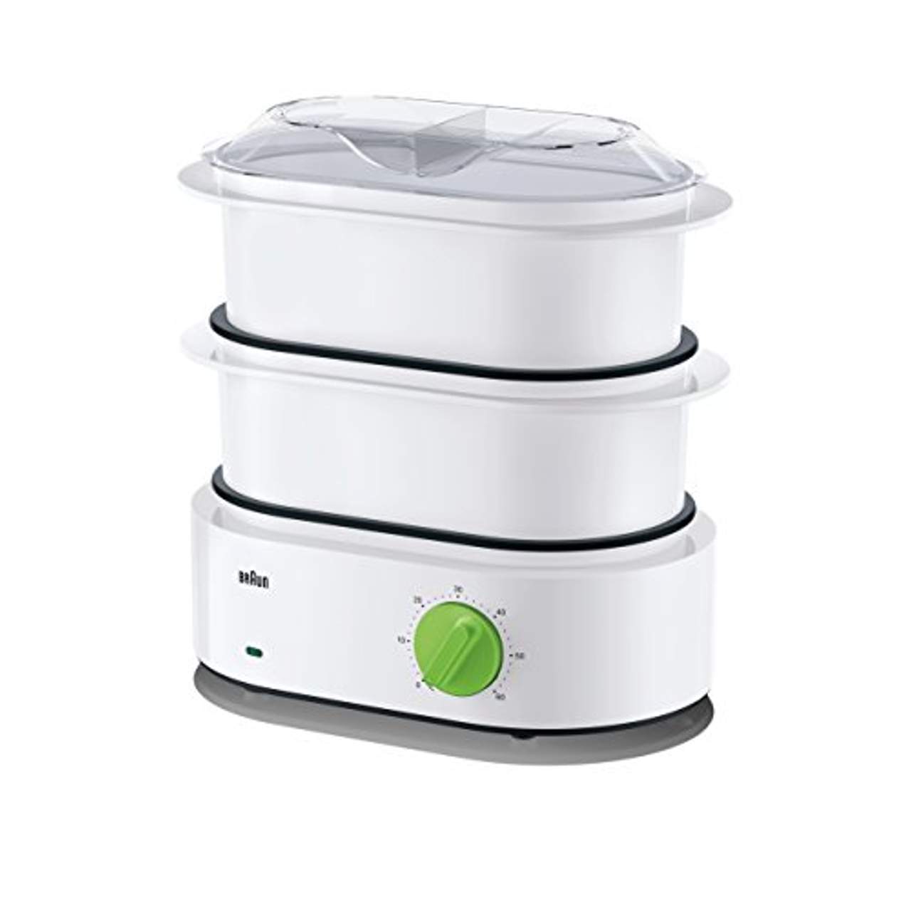Braun Tribute Collection FS 3000 DampfgarerDer Dampfgarer der TributeCollection verfügt über den einzigartigen Dampfbeschleuniger. Damit beginnt das Dampfgaren innerhalb von nur 45 Sekunden. Lästige Wartezeiten während des Aufwärmens entfallen somit für immer. Die praktische Zeitschaltuhr erlaubt das minutengenaue Einstellen der Garzeit und bietet ein absolut sicheres Kochen:Nach Ablauf der gewählten Zeit schaltet das Gerät automatisch ab.Umfangreiches Zubehör und platzsparende AufbewahrungDer Dampfgarer kommt mit zwei 3,1 Liter fassenden, Universal-Dampfkörben, einer Schale für Reis und Flüssiges wie Suppen oder Terrinen und einer dunklen Extra-Schale für färbende Speisen. Zwei Tropfschalen fangen entstehendes Kondensat auf und verhindern, dass sich die Aromen im Dampfgarer vermischen.Die Dampfkörbe sind ineinander stapelbar, womit das Gerät auch durch seine platzsparende Aufbewahrung punktet.Dank der BPA-freien Dampfkörbe und Schüsseln bereiten Sie Ihre Lebensmittel schonend und gesund zu. Das Gerät ist sogar geeignet für die Zubereitung von Babynahrung.