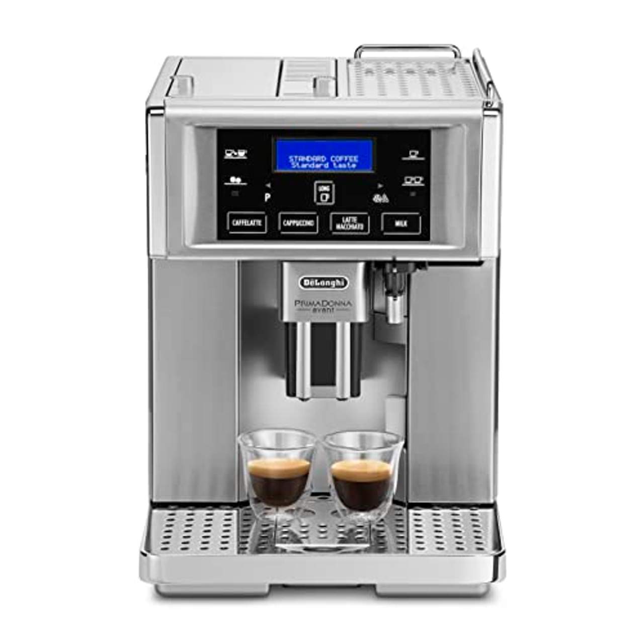 De'Longhi ESAM6720 PrimaDonna Avant KaffeevollautomatFaszinierend glänzend. Vom ersten Moment an zieht die PrimaDonna Avant alle Blicke auf sich. Denn in ihrem glanzvollen Gehäuse aus edlem Chromstahl spiegelt sich alles, was diese Maschine so einzigartig macht: Schönheit und Ausdrucksstärke. Langlebigkeit und Qualität.Lebensart und Handwerkskunst. Bereiten Sie mit der PrimaDonna Avant Kaffeespezialitäten wie Cappucino, Latte macchiato, Caffè Latte oder Long-Coffee zu. * „LONG COFFEE“-FUNKTION * CAPPUCCINO, CAFFÈ LATTE, LATTE MACCHIATO, LONG COFFEE UND HEISSE MILCH AUF KNOPFDRUCK * EINFACHE REINIGUNG * „LONG COFFEE“-FUNKTION „Long Coffee“-Funktion für den traditionellen Frühstückskaffee im Schwallbrühverfahren. * CAPPUCCINO, CAFFÈ LATTE, LATTE MACCHIATO, LONG COFFEE UND HEISSE MILCH AUF KNOPFDRUCK Extra großes Sensorbedienfeld mit Direktwahltasten für Cappuccino, Latte Macchiato, Caffè Latte, heiße Milch, „Long Coffee“ und inkl. individueller Programmierfunktion „Mein Kaffee“. * EINFACHE REINIGUNG Auf Knopfdruck führt das Gerät einen Spülvorgang des integrierten automatischen Milchaufschäumers durch. Der Milchbehälter kann zwischendurch oder nach dem Gebrauch im Kühlschrank aufbewahrt werden. * Gehäuse und Front aus hochwertigem Chromstahl 430 * Extra großes Sensorbedienfeld mit Direktwahltasten für Cappuccino, Latte macchiato, Caffè Latte, heiße Milch, Long-Coffee und inkl. individueller Programmierfunktion „Mein Kaffee“ * „Long-Coffee“-Funktion für den traditionellen Frühstückskaffee im Schwallbrühverfahren * Patentiertes Milchaufschäumsystem * Varioregler für Milchschaumkonsistenz * Abnehmbarer, spülmaschinengeeigneter Milchbehälter, kann separat im Kühlschrank aufbewahrt werden und führt auf Knopfdruck eine Reinigung der Milchleitungen mit Heißwasser und Dampf durch * Zusätzliche Milchaufschäumdüse * Herausnehmbare wartungsarme Brühgruppe * Integrierter De’Longhi Wasserfilter * „Vorbrüh“-Aromasystem für perfekten Kaffeegenuss * 250 g Bohnenbehälter * Für Kaffeebohnen und Kaffeepulver geeignet * Extra leises Kegelmahlwerk (13-stufig) * Fünf voreingestellte Kaffeestärken * Frontal herausnehmbarer 1,8 l Wassertank * Beheizte Tassenabstellfläche * Höhenverstellbarer Kaffeeauslauf und aufklappbares Abtropfgitter für bis zu 15 cm hohe Gläser * Abnehmbare Abtropfschale mit Wasserstandsanzeige * Programmierbare Abschaltung * Pumpendruck 15 bar