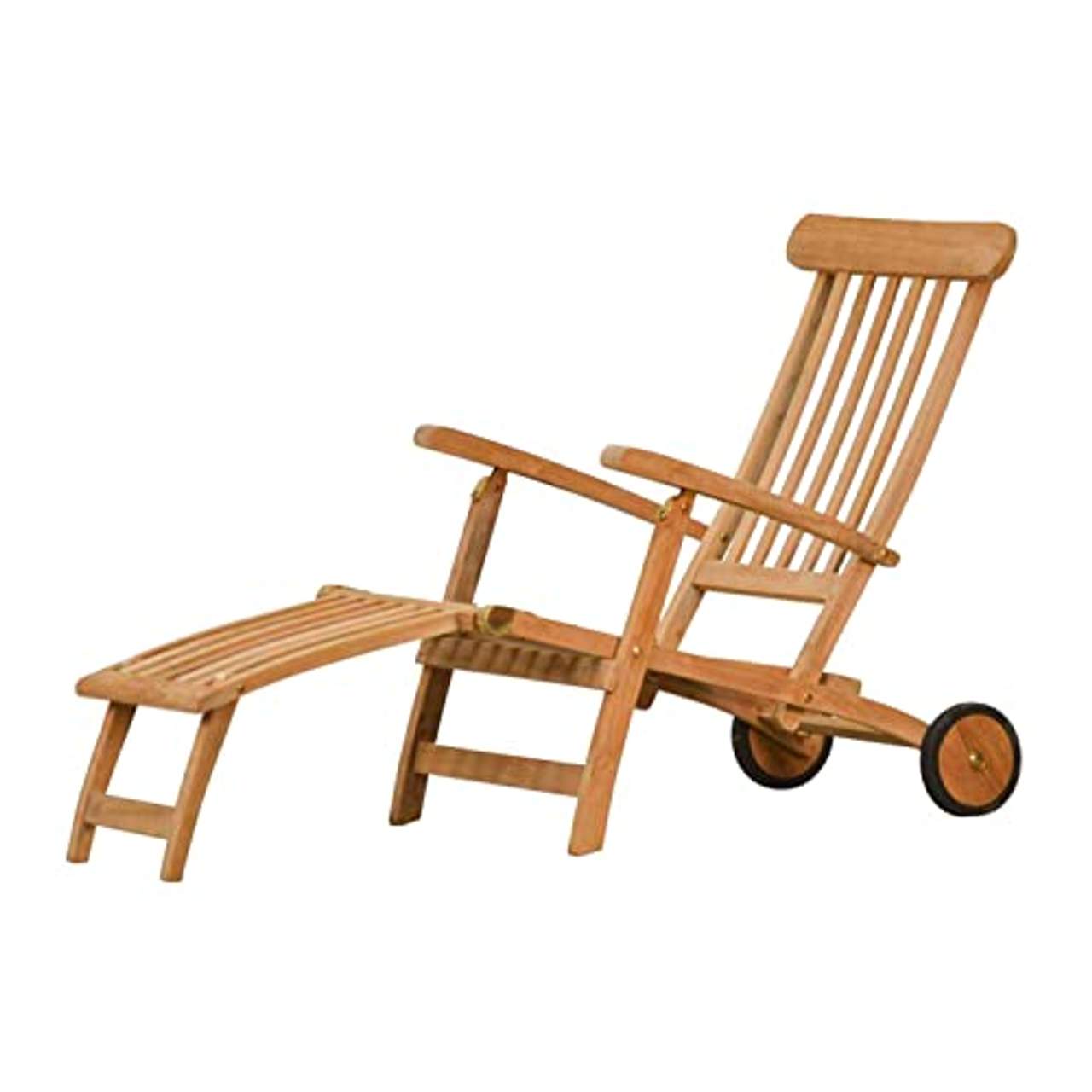 Kai Wiechmann Liegestuhl Holz Teak Deckchair Gartenliege SonnenliegeKai Wiechmann ist die Premiummarke für erstklassige Gartenmöbel aus hochwertigen Materialien.Mit diesem Teak Deckchair mit Rad gönnen Sie sich einen Gartenstuhl, der nicht nur extrem praktisch ist, sondern auch höchsten Sitzkomfort bietet. Er ist aus massivem Plantagenteakholz gefertigt, bietet eine hohe Wetterbeständigkeit und ist somit ganzjährig für alle Gärten, Terrassen und Balkone geeignet.Dank der 3-fach verstellbare Rückenlehne findet jeder auf diesem Teak Relaxstuhl die perfekte Liegeposition. Er punktet außerdem mit einer integrierten Fußablage und mit einem einzigartigen Preis-Leistungs-Verhältnis. Der Teak Sonnenstuhl wird fertig montiert geliefert, lässt sich bei Bedarf leicht zusammenklappen und platzsparend verstauen.Mit diesem Gartenmöbel genießen Sie die herrliche Freiluftsaison in vollen Zügen!Für diese klappbare Teak Sonnenliege bietet Kai Wiechmann auch passende Polsterauflagen in verschiedenen Farben und eine atmungsaktive Schutzhaube an. HIGHLIGHTS:Hochwertiges Teakholz aus nachhaltiger Plantagenwirtschaftabsolut witterungsbeständig3-fach verstellbare Rückenlehne und integriertes FußteilBeschläge aus rostfreiem Messing DETAILS:Maße (aufgeklappt): B/H/T 58/100/150 cmMaße (zusammengeklappt): 58/130/24 cmSitzfläche: 50 x 52 cm (B x T)Sitzhöhe (höchste Stelle): 35 cmSitzhöhe (niedrigste Stelle): 21 cmArmlehnenhöhe (höchste Stelle): 59 cmMaterial: Teakholz