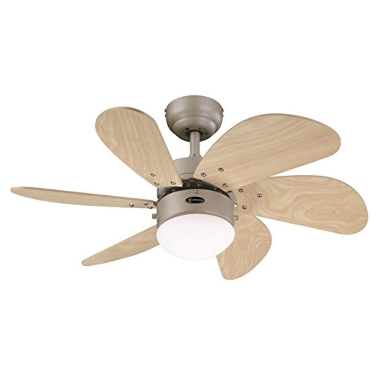 76 cm Deckenventilator Turbo Swirl 78158Hell, freundlich und besonders beliebtDer Turbo Swirl gehört zu den meistgekauften Westinghouse Deckenventilatoren. Die Gehäuseflächen in Titanfarben, die flache Einzellampe mit Opalmilchglas und die 6 geschwungenen Flügel in hellem Ahorn verleihen dem Turbo Swirl sein beliebtes heiteres Erscheinungsbild. Ein langlebiger und nahezu geräuschloser Wechselstrommotor aus kaltgewalztem Stahl sorgt ganzjährig für Komfort: ein angenehmes Klima im Sommer- und eine optimale Wärmeverteilung im Winterbetrieb.