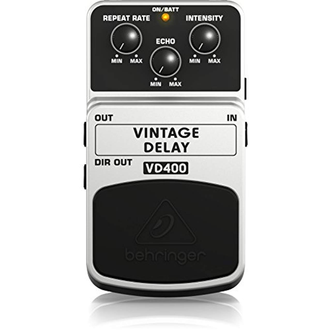 Best Price Square Guitar PedalVintage Delay Pedal für E-GitarreSeparate Intensity-, Echo- und Repeat Rate-ReglerBis zu 300ms Delay-ZeitAdvanced Noise Reduction CircuitBlaue Status-LED AnzeigeEin- und Ausgänge im 6,3mm KlinkenformatDirect OutBetrieb per 9 V Batterie oder einem VD400 im ÜberblickDas Behringer VD400 Vintage Delay ist genau das richtige Pedal für klassische Slapback Delays und Analog Delay Sounds. Mit einem klassischen Eimerkettenspeicher verfügt das Behringer Delay über eine Delayzeit von bis zu 300ms, während der Noise Reduction Circuit für mehr Signal bei weniger Störgeräuschen sorgt.Ansonsten wird das Behringer Vintage Delay recht klassisch über separate Regler für Echos, Delayzeit und Effektintensität gesteuert.MS-ID:GIT0012672-000Hersteller:BehringerArt:Delay/EchoBauform:EffektpedalAnzahl Kanäle:1Stereo:NeinLED-Anzeige:JaEffekteinschleifweg:NeinRecording-Ausgang:NeinUSB Anschluss:NeinMidi Schnittstelle:NeinAnschluss für Expressionpedal:NeinFußschalteranschluss:NeinKopfhöreranschluss:NeinSpannung (Volt):9Stromverbrauch (mA):30Batteriebetrieb:Jainkl. Netzteil:NeinBreite (mm):70Länge (mm):123Höhe (mm):54Gewicht (kg):0.33