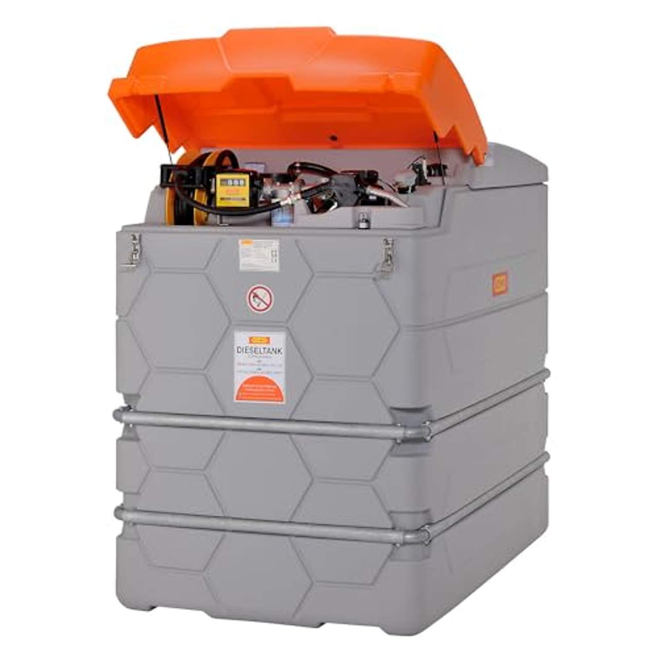 Diesel Stationäre Tankanlage CEMO 2500 LCUBE-Dieseltank, Outdoor Premium, Inhalt 2500 l, mit Elektropumpe 72 l/min. Anlieferung = montiert. Inhalt = 2500 Liter. Länge = 1200 mm. Breite = 1800 mm. Höhe = 1800 mm. Gewicht = 255 kg. Farbe = grau. Material = Polyethylen (PE). Temperaturbeständigkeit = bis +30 °C. Ausstattung = mit Elektropumpe 72 l/min. Deckel = ja. Deckelfarbe = orange. Ausführung = mit Klappdeckel. Prüfzeichen = Z-40.21-510. Für Medien = Diesel. Schlauchlänge = 8 m. Einsatzort = Innen- und Außenbereich. Produkttyp = Tankanlagen. Mit Klappdeckel - zugelassen zur Aufstellung im Innen- und Außenbereich. Zähler K33, Filter mit Wasserabscheider, Schlauchaufroller mit 8 m Schlauch. Elektropumpe 230 V mit Durchflussmengenzähler und Automatik-Zapfpistole mit Zapfpistolenhalter. Schlauchaufroller mit 8 m Schlauch. Befüllanschluss mit TW-Kupplung und Grenzwertgeber. Filter mit Wasserabscheider. Komplett mit montiertem Zubehör. Mit allgemeiner bauaufsichtlicher Zulassung Z-40.21-510. Als Komplettanlage entwickelt - alle Komponenten sind optimal integriert und geschützt. Keine abstehenden, störenden Teile - optimales Handling. Integrierte Auffangwanne, optische Leckageanzeige, Entlüftungskappe, Füllstandsanzeiger. Komplett montiert.