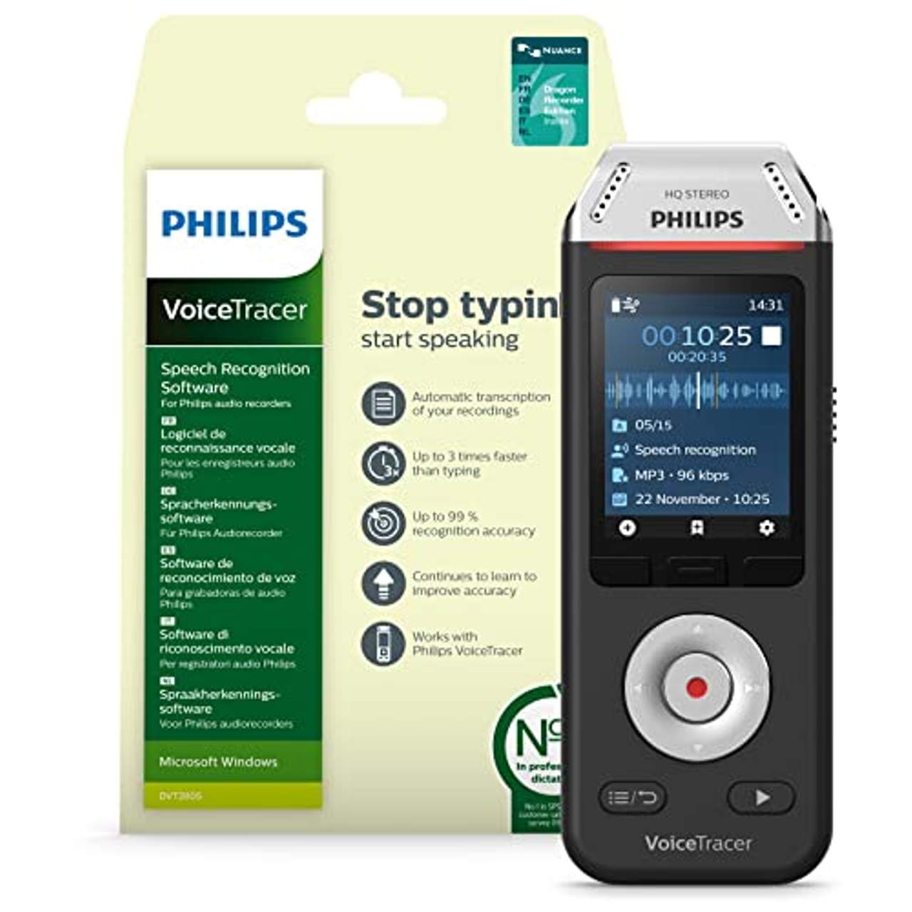 Philips VoiceTracer DVT2810 Audiorecorder Aufnahmegerät digitales DiktiergerätPhilips DVT 2810 VoiceTracer AudiorecorderHighlights:Zwei High-Fidelity-Mikrofone für herausragende AudioqualitätMP3- und PCM-Stereoaufnahmen für klare Wiedergabe und einfaches Teilen von DateienDank Spracherkennungssoftware müssen Sie Dokumente und Texte nicht mehr über die Tastatur eintippenAutomatische Transkription, bis zu 3 Mal schneller fertig als selbst getipptHochwertige Aufnahmen mit automatischer TranskriptionDie automatische Transkription wandelt Ihre Aufnahmen schnell, einfach und korrekt in geschriebenen Text um. So können Sie unterwegs Dokumente und Notizen in hoher Qualität aufnehmen und dann bei der Rückkehr an den Arbeitsplatz den Recorder an den Computer anschließen und die Dateien übertragen.Die mitgelieferte Software transkribiert Ihre Aufnahme automatisch.Zwei High-Fidelity-Mikrofone für maximale VerständlichkeitDie beiden High-Fidelity-Stereomikrofone ermöglichen klare und deutliche Sprachaufnahmen mit reduzierten Hintergrundgeräuschen, selbst in lauten Umgebungen. Eine gute Aufnahmequalität ist die Grundvoraussetzung für eine verständliche Wiedergabe und korrekte Spracherkennungsergebnisse.MP3- und PCM-Stereoaufnahmen für klare Wiedergabe und einfaches Teilen von DateienAls Aufnahmeformate stehen MP3 und PCM zur Wahl.Aufnahmen im beliebten MP3-Format können praktisch überall abgespielt und einfach mit anderen geteilt werden. Das PCM-Format (WAV) ist ein Format für verlustfreie und unkomprimierte Stereoaufnahmen, deren Klangqualität der von CDs gleichkommt.Audioszenen für jederzeit perfekte Audio-EinstellungenDer Philips VoiceTracer wird mit voreingestellten Szenen ausgeliefert, die die Aufnahmeeinstellungen automatisch an die jeweilige Aufnahmesituation - Aufnahme für Spracherkennung, Notizen, Interview, Vortrag, Musik oder Besprechung - anpassen.8 GB interner Speiche für bis zu 88 Tage AufnahmezeitDer 8 GB große interne Speicher bietet Platz für bis zu 88 Tage durchgängiges Aufnehmen.Wiederaufladbarer Lithium-Ionen-Polymer-Akku für extralange AufnahmedauerDer integrierte Lithium-Ionen-Polymer-Akku, der bequem per Standard-USB-C-Kabel aufgeladen werden kann, hat genug Kapazität für bis zu 36 Stunden Aufnahmen.So ist der Audiorecorder stets einsatzbereit, wenn Sie ihn brauchen.Großes Farbdisplay für gut lesbare Informationen zum AufnahmestatusÜber das große und scharfe Farbdisplay können Sie alles auf einen Blick erfassen und lesen. Die klar strukturierte Benutzeroberfläche kann in sieben Sprachen angezeigt werden und ist für eine einfache, intuitive Bedienung optimiert.Ein separates Gerät, das ohne Unterbrechungen aufnehmen kannGegenüber einem Smartphone hat ein separater Audiorecorder unter anderem den Vorteil, dass Sie auch über lange Zeit aufnehmen können, ohne von eingehenden Textnachrichten oder Anrufen gestört zu werden.Außerdem ist Ihr Smartphone in dieser Zeit nicht blockiert und Sie können es parallel nutzen.Sprachaktivierungsfunktion zum Aufnehmen ohne Einsatz der HändeMit „Sprachaktivierte Aufnahme“ können Sie Aufnahmen starten, ohne die Hände verwenden zu müssen. Wenn aktiviert, startet die Aufnahme automatisch, sobald Sie zu sprechen beginnen.Hören Sie auf zu sprechen, wird die Aufnahme pausiert, und wenn Sie weitersprechen, wird sie automatisch fortgesetzt.Dank Spracherkennungssoftware müssen Sie Dokumente und Texte nicht mehr über die Tastatur eintippenDie mitgelieferte Spracherkennungssoftware wandelt Ihre Sprachaufnahmen automatisch in ein Textdokument um, sodass Sie sich das mühevolle Eingeben über die Tastatur sparen können.Sprachaufnahmen werden automatisch transkribiert - der fertige Text ist bis zu 3 Mal schneller fertig als selbst getipptMit der Spracherkennungssoftware lassen sich Dokumente mindestens dreimal so schnell erstellen wie durch die Eingab über die Tastatur. Texte und Notizen diktieren, Recorder an den Computer anschließen und auf „Transkribieren“ klicken - den Rest erledigt die Software für Sie.Außergewöhnliche Erkennungsgenauigkeit von bis zu 99 %Die Erkennungsgenauigkeit der Spracherkennungssoftware liegt bei beeindruckenden bis zu 99 %. Auch Tippfehler gehören der Vergangenheit an.Die Software lernt ständig dazu, um die Spracherkennungsgenauigkeit weiter zu verbessernDer intelligente Algorithmus lernt aus den Korrekturen, die Sie am transkribierten Text vornehmen.Das heißt: je häufiger Sie die Software verwenden, desto genauer werden die Ergebnisse. Die Software merkt sich auch Muster und von Ihnen häufig verwendete Formulierungen und kann so vorhersagen, was wahrscheinlich als Nächstes folgt - mit positiven Folgen für die Erkennungsgenauigkeit. Eigenschaften:Kopfhörer: 3,5 mm; Impedanz: mindestens 16 OhmUSB: Typ C, High-Speed USB 2.0Display: LCD-Farbdisplay mit Hintergrundbeleuchtung; Diagonale: 5 cm (2"); Auflösung: 240 x 320 PixelIntegriertes Mikrofon: 2 omnidirektionale Mikrofone für StereoaufnahmenSignal-Rausch-Verhältnis: 58 dBAufnahmeformate: MPEG1 Layer 3 (MP3), PCM (WAV)Aufnahmequalität: MP3 (8, 32, 64, 96, 128, 192, 256, 320 kBit/s), PCM (22 kHz/16 Bit, 44,1 kHz/16 Bit, 48 kHz/16 Bit)Audioszenen: Notizen, Spracherkennung, Interview, Vortrag, Besprechung, Musik, BenutzerdefiniertAufnahmedauer (interner Speicher):2147 h (MP3, 8 kBit/s), 536 h (MP3, 32 kBit/s), 268 h (MP3, 64 kBit/s), 178 h (MP3, 96 kBit/s), 134 h (MP3, 128 kBit/s), 89 h (MP3, 192 kBit/s), 67 h (MP3, 256 kBit/s), 53 h (MP3, 320 kBit/s), 24 h (PCM, 22 kHz/16 Bit), 12 h (PCM, 44,1 kHz/16 Bit), 11 h (PCM, 48 kHz/16 Bit)Voraufnahmemodus: 5, 10, 15 Sekunden PufferDateibearbeitungsfunktionen: Überschreiben, AnhängenFunktion zum automatischen Unterteilen: 15, 30, 60 MinutenFunktion für automatische Lesezeichen: 5, 10, 15, 30, 60 Minuten; Lesezeichenfunktion: bis zu 32/DateiSprachaktivierte Aufnahmen: 25 StufenOne-Touch-Sofortaufnahmen, Funktion zur Aufnahmeüberwachung, Aufnahme-Timer, WindfilterPege