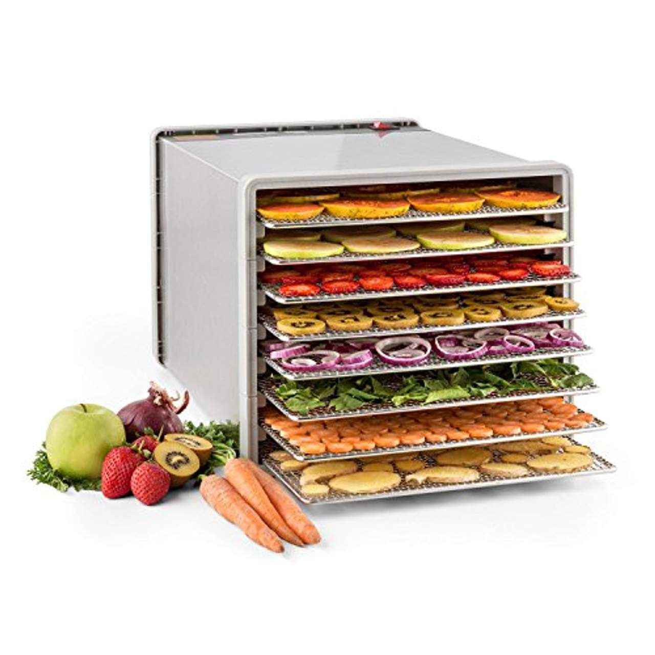 Fleisch, zum Auffrischen von Gebäck oder zur Herstellung von Leckerlis für Haustiere.Große Trockenfläche von 0,86 m² auf 8 feinmaschigen Etagen in