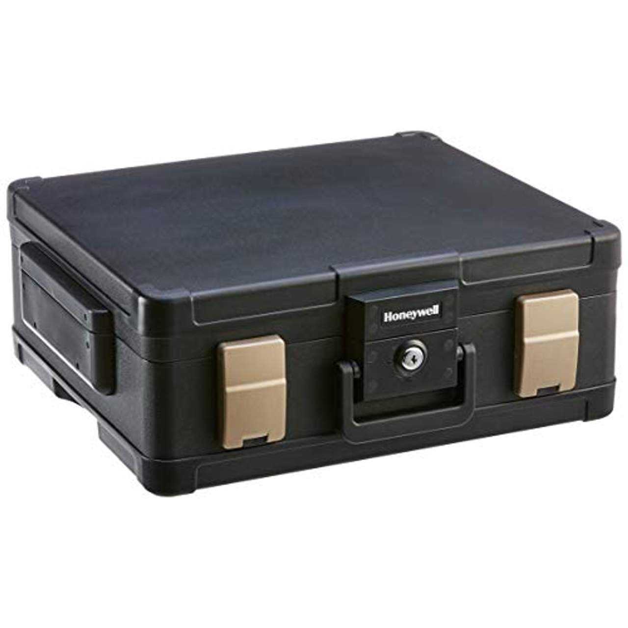 Honeywell 1104G DokumentenkassetteDie Feuerfeste Dokumentenkassette bietet 60 Minuten Feuerschutz für wichtige Dokumente wie z.B. Wertpapiere, Bargeld etc. und nichtmagnetische Digitalmedien wie CDs, DVDs, USB-Sticks etc. passend für Din A4 und B4 Format (Din A4 Ordner, Hefter etc.) 60 Minuten Sicherheit bei Temperaturen bis 927 Grad laborgeprüfter Widerstandsgrad (UL zertifiziert!), hergestellt aus hochentwickeltem und speziell versiegeltem Polymer-Kunststoff unabhängige Prüfungen bestätigen, dass der Innenbereich für bis zu 24 Stunden unter Wasser trocken bleibt doppelte Sicherheitslaschen für luft- und wasserdichtem Verschluss Sicherheitszylinderschloss sorgt für zusätzlichen Diebstahlschutz verdeckte Scharniere für ein formschönes Design stabiler Tragegriff für Transport und auf Reisen zur Sicherstellung des Brand- und Wasserschutzes stets flach mit dem Deckel nach oben lagern!Gewicht: 25,4 kg Abmessungen Dokumentenbox: Außen (L x B x H): 50,7 x 43,6 x 18,7 cm Innen (L x B x H): 37,6 x 30,4 x 9,6 cm Volumen: