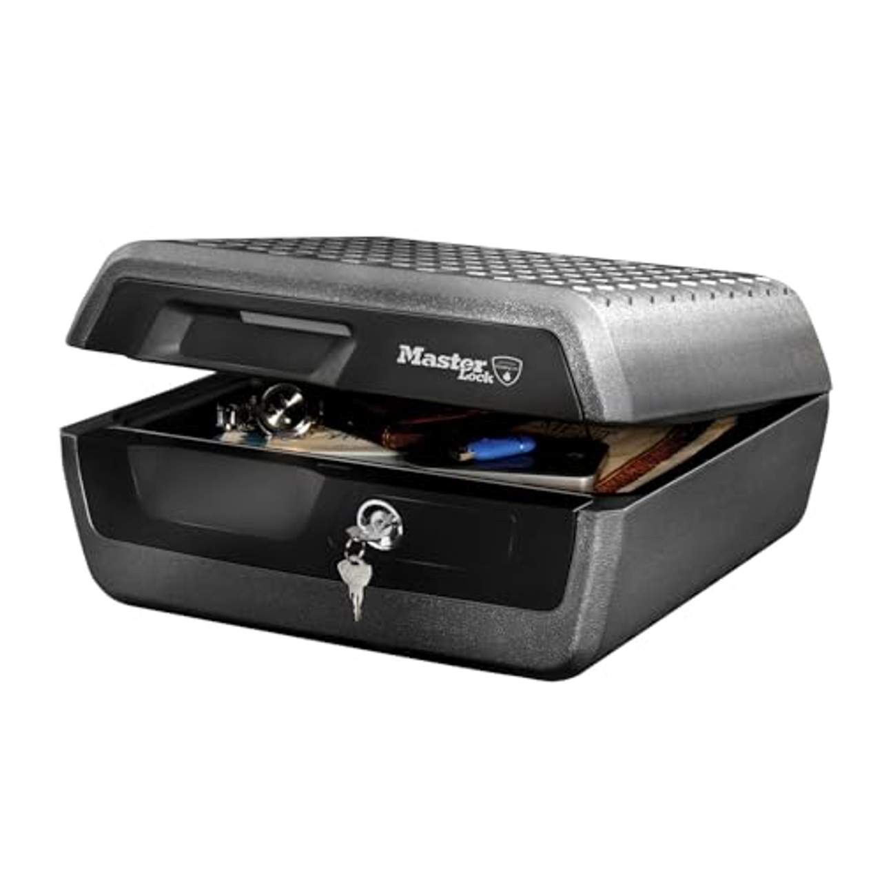Master Lock SicherheitskassetteDiese Sicherheitskassette von Master Lock dient zur optimalen Aufbewahrung Ihrer Wertsachen, Dokumente und digitalen Datenträger, damit diese vor Feuer und Wasser gut geschützt bleiben. Es handelt sich um eine große, feuer- und wasserbeständige Kassette mit einem Volumen von 10,2 L. Sie hat das UL/ETL Feuerbeständigkeitszertifikat erlangt (1/2 Stunde bei 843°C) und stellt sicher, dass Ihre Dokumente und andere Wertgegenstände im Falle eines Brandes oder Überschwemmung geschützt bleiben.Dank 2 Stahlbolzen, die mit verdeckten Scharnieren verriegelt sind, hält dieser Minitresor Ihre wertvollen Gegenstände sicher aufbewahrt. Zwei Schlüssel sind enthalten.Diese strapazierfähige Sicherheitskassette kann mit Schrauben befestigt, so dass sie auch vor Diebstahl geschützt wird. Sie wiegt 12,2 kg. 403278 Weitere Hinweise Innenvolumen: 10,2 L Außenabmessungen: 19,3 × 41,9 × 37,5 cm (H × B × T) Innenabmessungen: 13,6 × 32,1 × 23,2 cm (H × B × T) Nettogewicht: 12,2 kg Farbe: Kohlegrau und Schwarz Material: Stahl