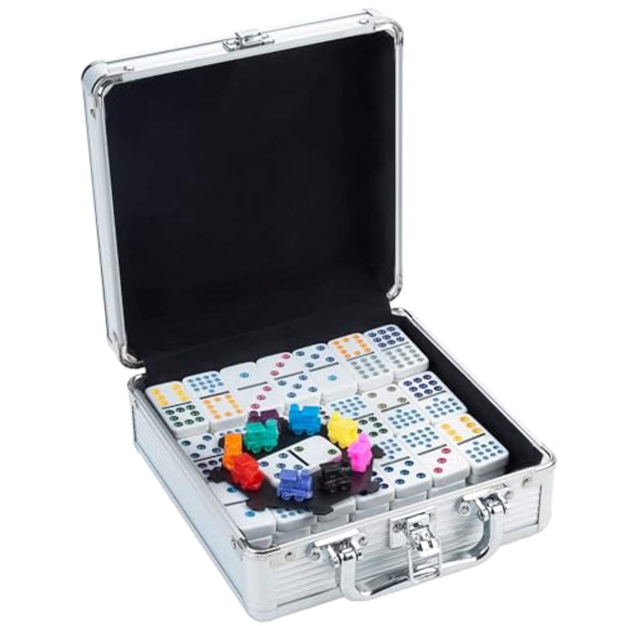 - Tragbar und langlebig: Dieses Spiel wird in einer Metallbox mit den Maßen 20x20x9 cm geliefert, so dass Sie es leicht überallhin mitnehmen können. Die Dominosteine sind aus Kunststoff und elfenbeinfarben mit abgerundeten Ecken und farbigen Punkten, was zu seiner Haltbarkeit beiträgt.