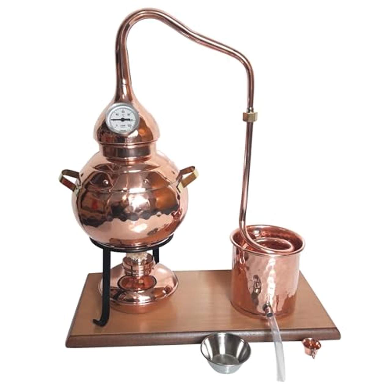 Neben der Destillationseinheit enthält das Modell Alambic Classico einen Brenner, ein Gestell und ein Thermometer zur präzisen Temperaturkontrolle während des Destillationsvorgangs.