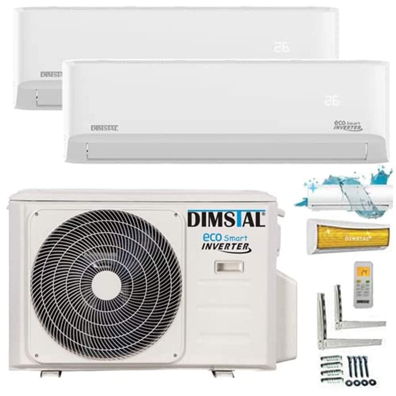 Die „DIMSTAL A++ A++ Duo-Split SelfClean WiFi-Ready Golden-Fin 2.6“ ist eine Multi-Split-Klimaanlage. Sie hat eine Selbstreinigungsfunktion und eine Gold-Fin-Lotus-Effektbeschichtung, die verhindert, dass sich Bakterien und Pilze auf den Lamellen absetzen. Das System ist leistungsstark, leise und sparsam und funktioniert mit 230V Haushaltsspannung. Mit einem SCOP-Wert von 5,5 ist sie hocheffizient und mit dem neuesten R32-Gas befüllt. Im Lieferumfang enthalten sind ein Außengerät, zwei 9000-Btu-EcoSmart-Innengeräte, eine Wandhalterung und Fernbedienungen.