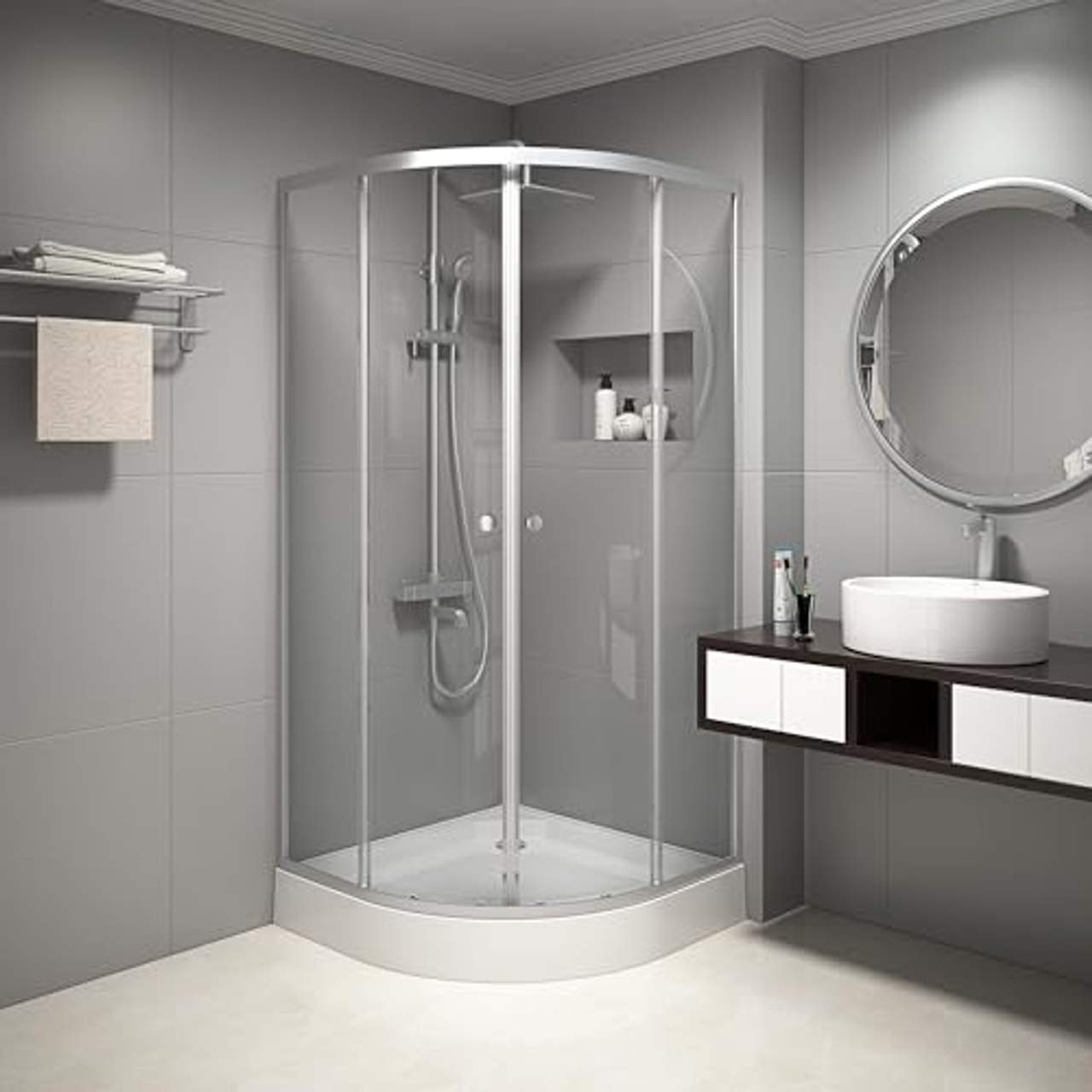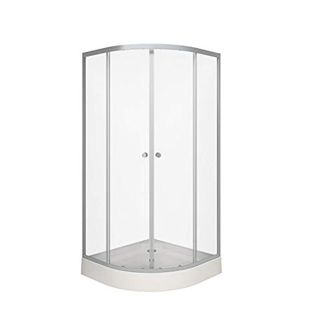 MARWELL FAC890 Duschkabine Komplett-SetWichtiges auf einen Blick: Radius 55 cm, Höhe 185 cm, Einstiegsbreite ca. 53 cm. Inklusive Duschwanne, Höhe 15 cm aus Acryl inklusive Abfluss mit verchromtem Deckel. Die Glaselemente bestehen aus 4 mm Einscheiben-Sicherheitsglas das für Stabilität sorgt. Glasdusche mit Schiebetür, die durch die leichtgängigen Doppellaufrollen ein besonders einfaches Öffnen und Schließen garantiert. Vollgerahmte Duschkabine aus hochwertigen Aluminiumprofilen in Silber Seidenmatt. Die Türelemente lassen sich für eine schnelle und einfache Reinigung im unteren Bereich aushängen.Im Lieferumfang von dem Komplett-SET sind enthalten: Glasdusche, Duschwanne, Abfluss mit verchromtem Deckel, Türgriffe, Wasserabweisprofile, Türdichtungen mit Magnetverschluss und Montagematerial. Produktbeschreibung: Mit der Duschkabine Crystal Round erwerben Sie ein komplettes Duschsystem inklusive Duschtasse, Glaswänden, Abfluss mit verchromtem Deckel und Türgriffen.Die Schiebetüren und Rückwände aus transparentem Klarglas