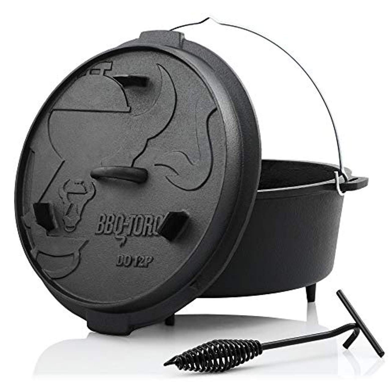 BBQ-Toro Dutch Oven Premium Serie I bereits eingebranntBBQ-Toro 12 QT Premium Dutch Oven - DO12P Der Marken-Kochtopf für Outdoor, Grillen und Feuer! Der Dutch Oven ist ein schwerer, traditioneller, gusseiserner Topf und ein exakt passender Deckel mit dem man überall kochen, braten, schmoren, frittieren, dünsten und backen kann. Der Dutch Oven reguliert dank seiner hohen Masse (Gusseisen) ungleichmäßige Hitze und ermöglicht so ein gleichmäßiges Garen.Einfach glühende Kohlen, Glut oder Grillbriketts auf den Deckel und unter den Topf geben und das Dutch Oven-Erlebnis kann losgehen. Der extra erhöhte Deckelrand und die drei Beine bieten optimale Bedingungen für Kohle und Co. Im Dutch Oven gelingen so kinderleicht Gerichte wie Schmorbraten, Eintöpfe, Brot, Kuchen und vieles mehr.Egal ob Feuerstelle, Grillplatz oder Lagerfeuer, der Gusstopf ist mobil und flexibel einsetzbar. Die drei Beine bieten stabilen Stand - ein separater Topfständer wird nicht benötigt. Speisen wie z.B. Fleisch werden im Dutch Oven einmalig zart und entwickeln ein