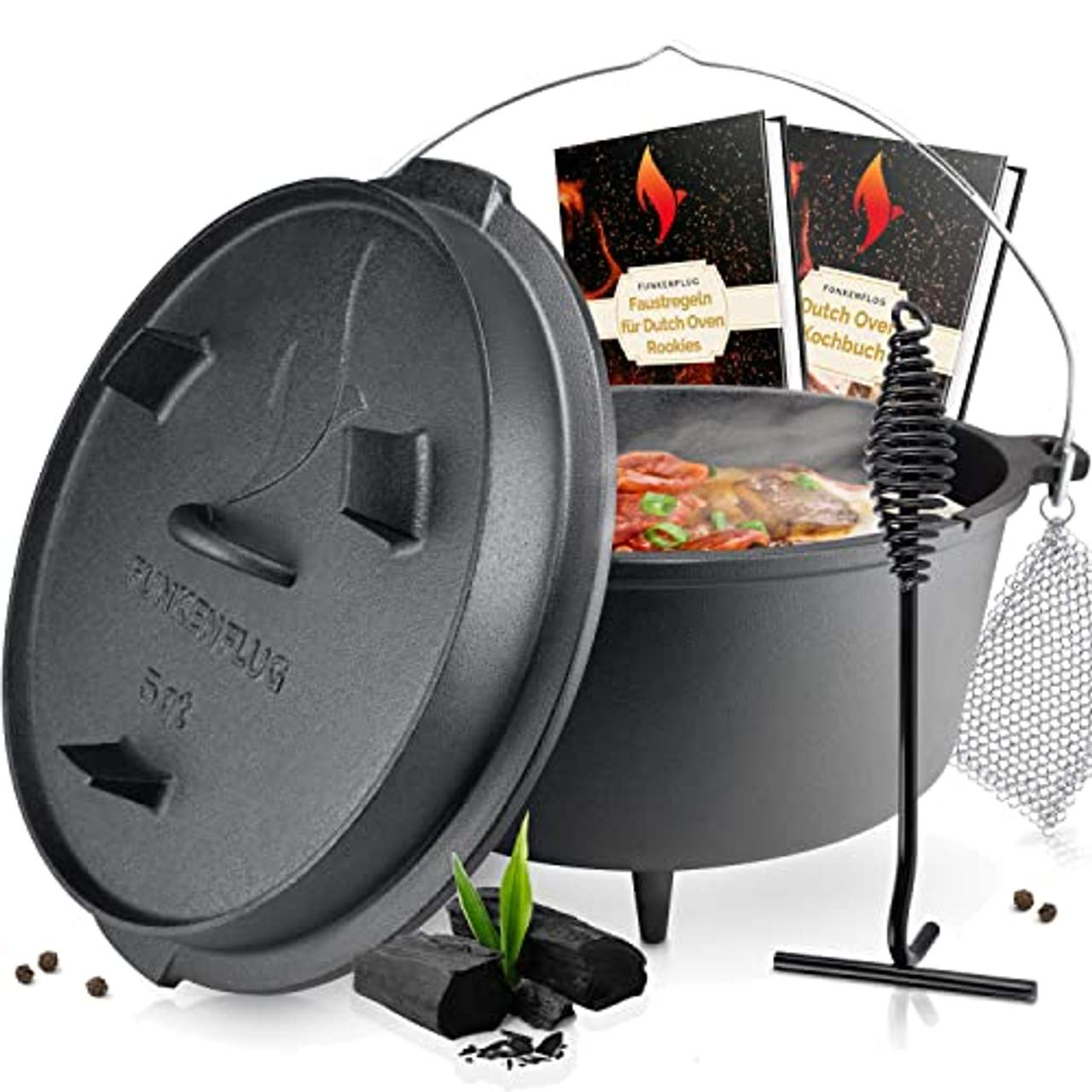Eingebranntes Dutch Oven Set [5 Liter]Egal ob du den Dutch Oven von FUNKENFLUG auf der Feuerstelle oder dem Grill benutzt - Wenn du dich für FUNKENFLUG entscheidest kommst du in den Genuss eines der schönsten Vergnügen im Leben … der gemeinsamen Zeit mit deinen liebsten Menschen am knisternden & wärmenden Feuer! Entscheide dich jetzt für FUNKENFLUG! Weitere Hinweise UNSER QUALITÄTSVERSPRECHEN – Wir versprechen euch eine lebenslange Freude an unserem Dutch Oven! Jeder Topf wird mit einer effektiven Rost-, und Antihaftbeschichtung voreingebrannt ausgeliefert! LIEBLINGSMENSCHEN ÜBERRASCHEN – Wage etwas neues! Überrasche deine Lieblingsmenschen mit leckeren Gerichten aus dem Dutch Oven Topf. Garantierte anheimelnde Stimmung & Gemütlichkeit beim Essen! PERFEKTE WÄRMEVERTEILUNG – Unser massiver & dickwandiger Dutch Oven Feuertopf aus hochwertigem Gusseisen speichert maximale Wärme vom Boden bis zu den Seitenwänden über mehrere Stunden hinweg. HUNGER STILLEN – Unser Gusseisen Topf hat Platz für 2-4 hungrige Mägen! Mit ca. 5 Liter Volumen, einem Innen ø von 26 cm & einer Höhe von 10 cm bekommst du alle Gäste immer satt & glücklich. DUTCH OVEN ZUBEHÖR – Egal ob Anfänger oder BBQ Profi! Mit der Transporttasche, Deckel Heber & dem Edelstahl Ringreinger startest du mit Leichtigkeit & überall in deine erste Dutchoven Session.