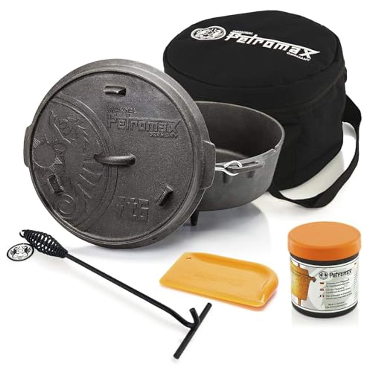 Das Petromax Feuertopf Starterset ist ein Dutch Oven der Marke „Petromax“. Er hat ein maximales Fassungsvermögen von 9,5 Litern, 8 Liter für den Topf und 2,5 Liter für den Deckel. Das verwendete Material ist Gusseisen und er kann von 8 bis 14 Personen benutzt werden. Die vorbehandelte Oberfläche macht ein Einbrennen überflüssig und das Set wird mit einem Deckelheber, einer Tasche, einer Pflegepaste und einem Schaber geliefert.