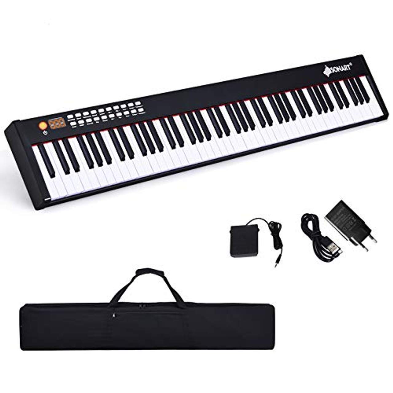 - Hochwertige Tasten & mit Fußpedal: Die Tasten bestehen aus hochwertigem ABS-Material, das ein angenehmes Gefühl beim Spielen des Instruments vermittelt. Außerdem sind alle 88 Tasten im Verhältnis 1:1 eingravierte Klaviertasten für ein authentisches Erlebnis und das Fußpedal kann den echten Klang wiederherstellen und den Klang empfindlicher machen.