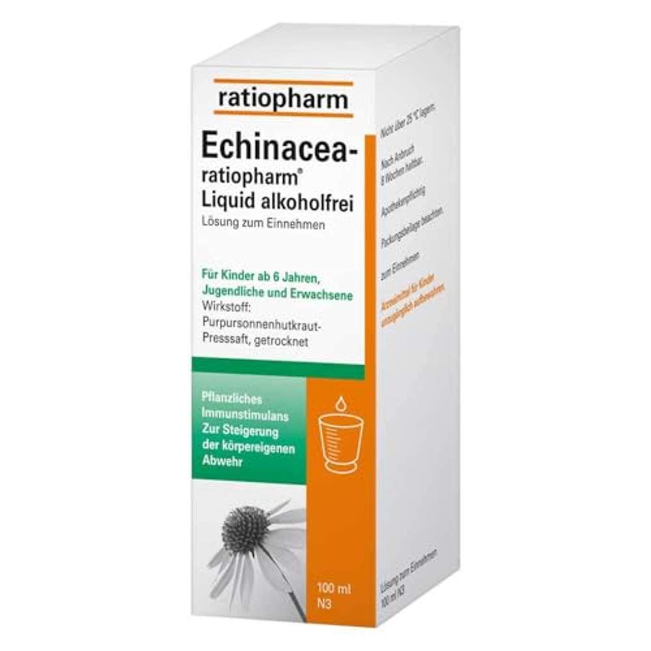 Echinacea Ratiopharm Liquid alkoholfrei 100 ml ist ein Arzneimittel, das das Immunsystem stärkt und bei Erkältungen unterstützt. Es enthält einen Extrakt aus der Heilpflanze Echinacea, die bereits den nordamerikanischen Indianern bekannt war. Der Wirkstoff ist der Presssaft des Purpursonnenhutes. Es wird zur unterstützenden Behandlung bei wiederkehrenden Infektionen der Atemwege oder der Harnwege eingesetzt. Die Versandkosten betragen 2,99 EUR, ab einem Bestellwert von 20 EUR ist der Versand kostenlos. Personen unter dem gesetzlichen Mindestalter können dieses Produkt nicht kaufen.