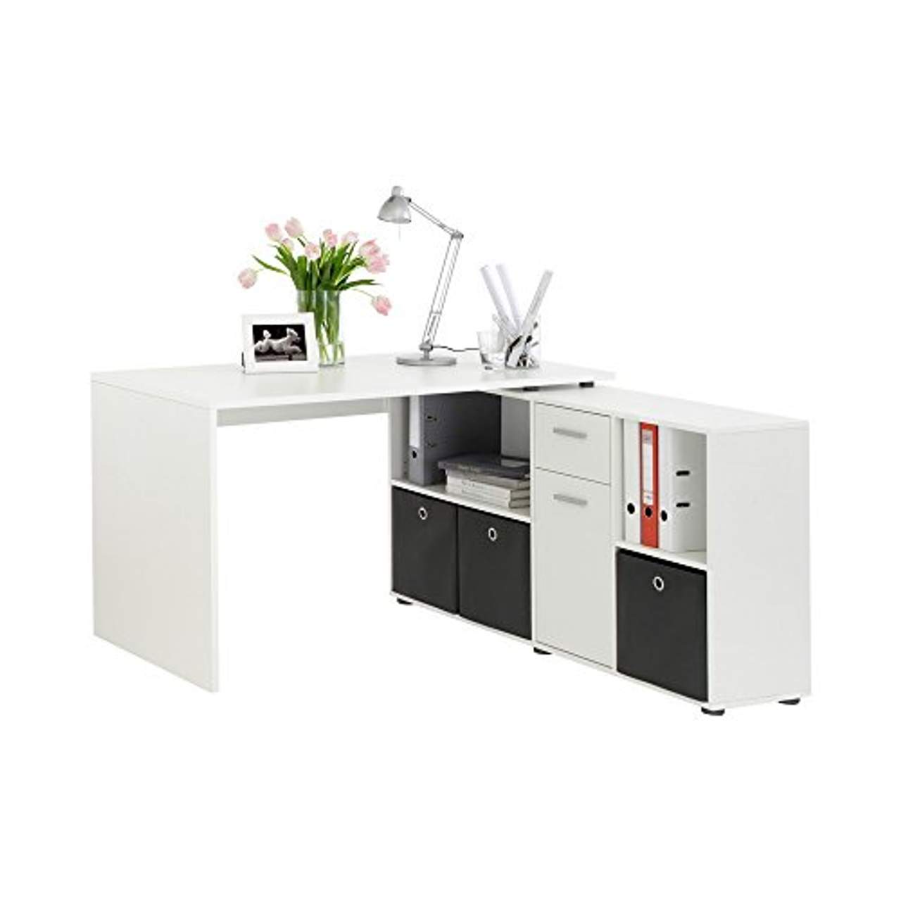 FMD Möbel 353-001 Schreibtisch-Winkelkombination Tisch caDie Schreibtisch-Kombination in Weiß zeichnet sich durch ein modernes und geradliniges Design aus. Der Schreibtisch wird mit dem Unterbau verbunden und kann so ganz nach den individuellen Anforderungen ausgerichtet werden. Das Regalteil kann gerade oder im Winkel auf der rechten oder der linken Seite angebracht werden.Mit einem Schubkasten, vier offenen Fächern und einer Tür bietet das Regal viel Platz. Tisch: B/H/T: ca. 136 x 74 x 66,5 cm Regal: B/H/T: ca. 137 x 71 x 33 cm Für noch mehr Vielfalt, können Sie unsere farbigen Faltboxen Alfa in den Schreibtisch integrieren. Qualitätsprodukt aus Deutschland zu günstigen Preisen. - In ausgewählten Filialen erhältlich -