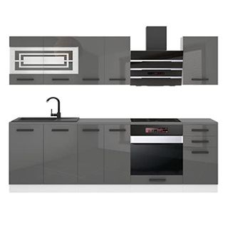 Mit ihrem praktischen Design in stilvollem Hochglanz Grau und Grau-Matt strahlt diese Küchenzeile Eleganz und Raffinesse aus. Die durchdachte Konstruktion sorgt dafür, dass all deine Küchenutensilien ordentlich aufbewahrt werden können und deine Küche zu einer gut organisierten Oase des Komforts wird.